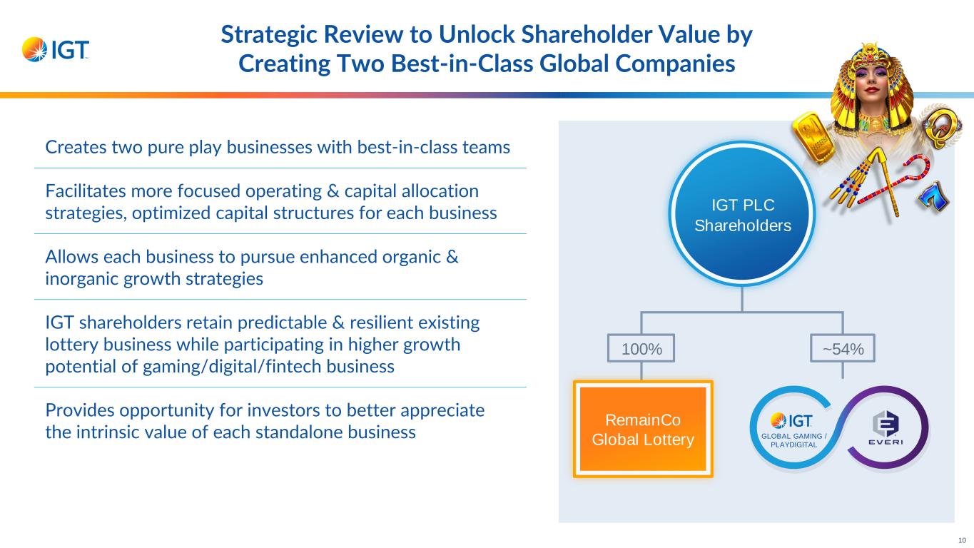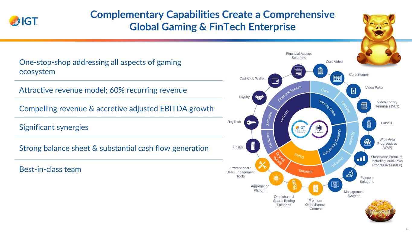 Strategic Review to Unlock Shareholder Value by Creating Two Best-in-Class Global Companies 10 Creates two pure play businesses with best-in-class teams Facilitates more focused operating & capital allocation strategies, optimized capital structures for each business Allows each business to pursue enhanced organic & inorganic growth strategies IGT shareholders retain predictable & resilient existing lottery business while participating in higher growth potential of gaming/digital/fintech business Provides opportunity for investors to better appreciate the intrinsic value of each standalone business ~54%100% IGT PLC Shareholders RemainCo Global Lottery GLOBAL GAMING / PLAYDIGITAL