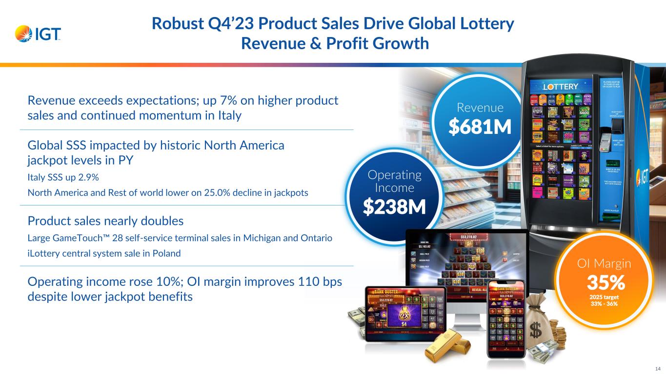 Robust Q4’23 Product Sales Drive Global Lottery Revenue & Profit Growth Revenue exceeds expectations; up 7% on higher product sales and continued momentum in Italy Global SSS impacted by historic North America jackpot levels in PY Italy SSS up 2.9% North America and Rest of world lower on 25.0% decline in jackpots Product sales nearly doubles Large GameTouch 28 self-service terminal sales in Michigan and Ontario iLottery central system sale in Poland Operating income rose 10%; OI margin improves 110 bps despite lower jackpot benefits Revenue $681M Operating Income $238M OI Margin 35% 2025 target 33% - 36% 14