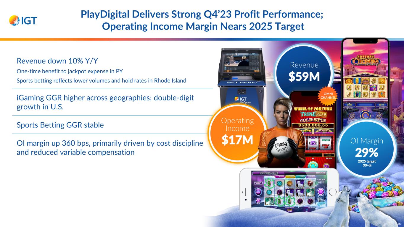PlayDigital Delivers Strong Q4’23 Profit Performance; Operating Income Margin Nears 2025 Target Revenue down 10% Y/Y One-time benefit to jackpot expense in PY Sports betting reflects lower volumes and hold rates in Rhode Island iGaming GGR higher across geographies; double-digit growth in U.S. Sports Betting GGR stable OI margin up 360 bps, primarily driven by cost discipline and reduced variable compensation Revenue $59M Operating Income $17M OI Margin 29% 2025 target 30+% OMNI CHANNEL 16