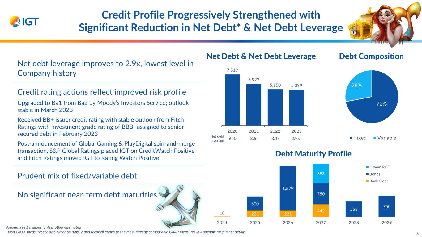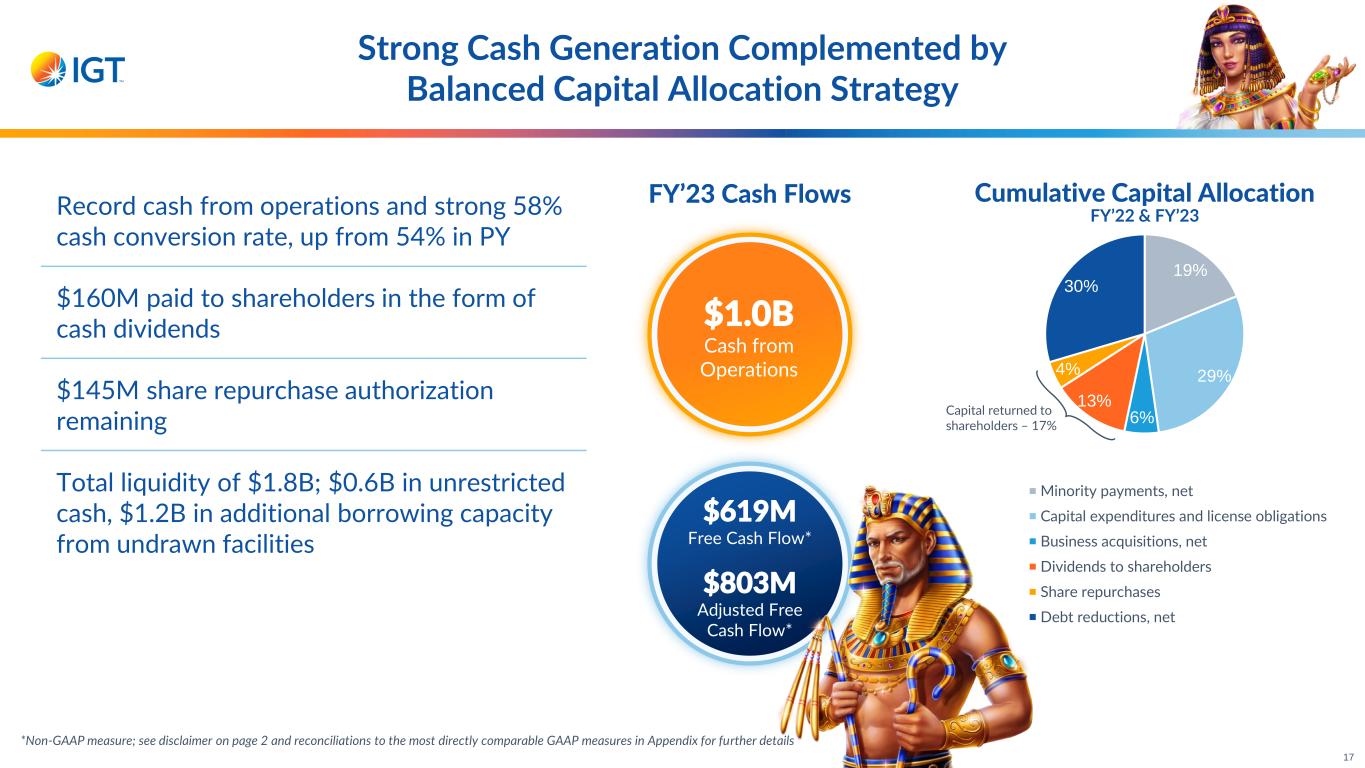 Credit Profile Progressively Strengthened with Significant Reduction in Net Debt* & Net Debt Leverage Net debt leverage improves to 2.9x, lowest level in Company history Credit rating actions reflect improved risk profile Upgraded to Ba1 from Ba2 by Moody’s Investors Service; outlook stable in March 2023 Received BB+ issuer credit rating with stable outlook from Fitch Ratings with investment grade rating of BBB- assigned to senior secured debt in February 2023 Post-announcement of Global Gaming & PlayDigital spin-and-merge transaction, S&P Global Ratings placed IGT on CreditWatch Positive and Fitch Ratings moved IGT to Rating Watch Positive Prudent mix of fixed/variable debt No significant near-term debt maturities Net Debt & Net Debt Leverage Amounts in $ millions, unless otherwise noted *Non-GAAP measure; see disclaimer on page 2 and reconciliations to the most directly comparable GAAP measures in Appendix for further details Debt Composition 16 221 221 442 500 1,579 750 553 750 683 2024 2025 2026 2027 2028 2029 Drawn RCF Bonds Bank Debt Debt Maturity Profile 16 7,319 5,922 5,150 5,099 2020 2021 2022 2023 6.4x 72% 28% Fixed VariableNet debt leverage 3.5x 3.1x 2.9x 18