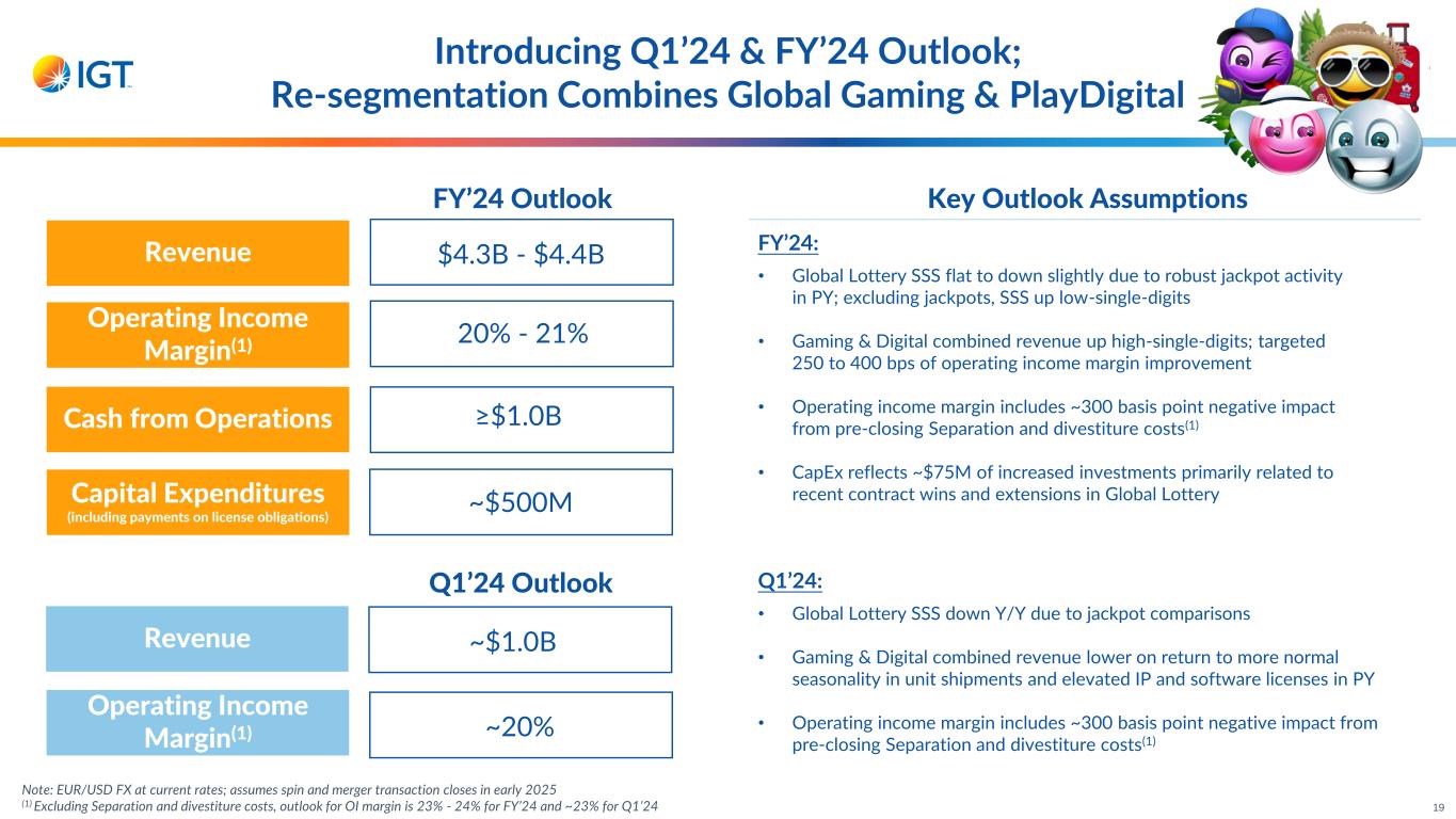 Revenue Operating Income Margin(1) Cash from Operations Capital Expenditures (including payments on license obligations) Introducing Q1’24 & FY’24 Outlook; Re-segmentation Combines Global Gaming & PlayDigital FY’24 Outlook $4.3B - $4.4B 20% - 21% ≥$1.0B ~$500M Key Outlook Assumptions Q1’24 Outlook Revenue Operating Income Margin(1) ~$1.0B ~20% 19 Note: EUR/USD FX at current rates; assumes spin and merger transaction closes in early 2025 (1) Excluding Separation and divestiture costs, outlook for OI margin is 23% - 24% for FY’24 and ~23% for Q1’24 FY’24: • Global Lottery SSS flat to down slightly due to robust jackpot activity in PY; excluding jackpots, SSS up low-single-digits • Gaming & Digital combined revenue up high-single-digits; targeted 250 to 400 bps of operating income margin improvement • Operating income margin includes ~300 basis point negative impact from pre-closing Separation and divestiture costs(1) • CapEx reflects ~$75M of increased investments primarily related to recent contract wins and extensions in Global Lottery Q1’24: • Global Lottery SSS down Y/Y due to jackpot comparisons • Gaming & Digital combined revenue lower on return to more normal seasonality in unit shipments and elevated IP and software licenses in PY • Operating income margin includes ~300 basis point negative impact from pre-closing Separation and divestiture costs(1)