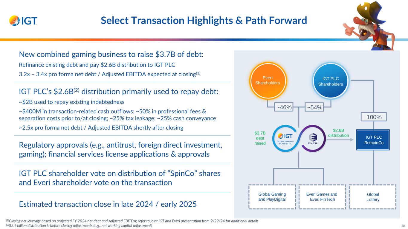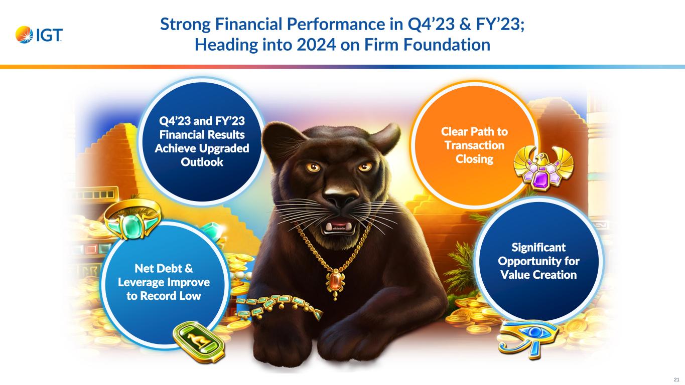 Select Transaction Highlights & Path Forward 20 New combined gaming business to raise $3.7B of debt: Refinance existing debt and pay $2.6B distribution to IGT PLC 3.2x – 3.4x pro forma net debt / Adjusted EBITDA expected at closing(1) IGT PLC’s $2.6B(2) distribution primarily used to repay debt: ~$2B used to repay existing indebtedness ~$400M in transaction-related cash outflows: ~50% in professional fees & separation costs prior to/at closing; ~25% tax leakage; ~25% cash conveyance ~2.5x pro forma net debt / Adjusted EBITDA shortly after closing Regulatory approvals (e.g., antitrust, foreign direct investment, gaming); financial services license applications & approvals IGT PLC shareholder vote on distribution of “SpinCo” shares and Everi shareholder vote on the transaction Estimated transaction close in late 2024 / early 2025 (1)Closing net leverage based on projected FY 2024 net debt and Adjusted EBITDA; refer to joint IGT and Everi presentation from 2/29/24 for additional details (2)$2.6 billion distribution is before closing adjustments (e.g., net working capital adjustment) Global Lottery Global Gaming and PlayDigital Everi Games and Everi FinTech ~54% 100% IGT PLC RemainCo ~46% $3.7B debt raised $2.6B distribution GLOBAL GAMING / PLAYDIGITAL Everi Shareholders IGT PLC Shareholders