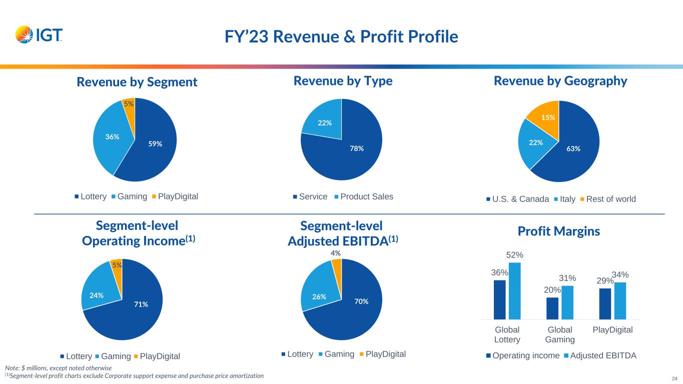 41% Note: $ millions, except noted otherwise (1)Segment-level profit charts exclude Corporate support expense and purchase price amortization 59% 36% 5% Lottery Gaming PlayDigital 78% 22% Service Product Sales 63% 22% 15% U.S. & Canada Italy Rest of world 71% 24% 5% Lottery Gaming PlayDigital 70% 26% 4% Lottery Gaming PlayDigital 36% 20% 29% 52% 31% 34% Global Lottery Global Gaming PlayDigital Operating income Adjusted EBITDA Revenue by Segment Revenue by Type Revenue by Geography Segment-level Operating Income(1) Segment-level Adjusted EBITDA(1) Profit Margins FY’23 Revenue & Profit Profile 24