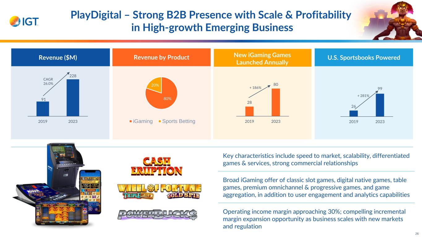 Global ASPs North America MLP Trends North America Unit ShipmentsGlobal Installed Base Operating Income Margin Global Gaming – Broad-based Momentum Across Diverse Revenue Streams & Improved Profit Profile 14% 20% 2019 2023 21,019 26,208 2019 2023 $13,400 $15,800 2019 2023 2019 2023 Installed Base Unit Shipments +~100% ~11,500 35 ,9 77 34 ,2 21 14 ,8 57 19 ,6 85 2019 2023 U.S. & Canada Rest of world 9 consecutive quarters of growth 6 consecutive quarters of growth + 6% + 18% +25% 25 Diversified gaming technology provider with 40+ years of success Positioned to grow across channels, product verticals, and geographies Compelling operating income margin expansion opportunity ~5,700