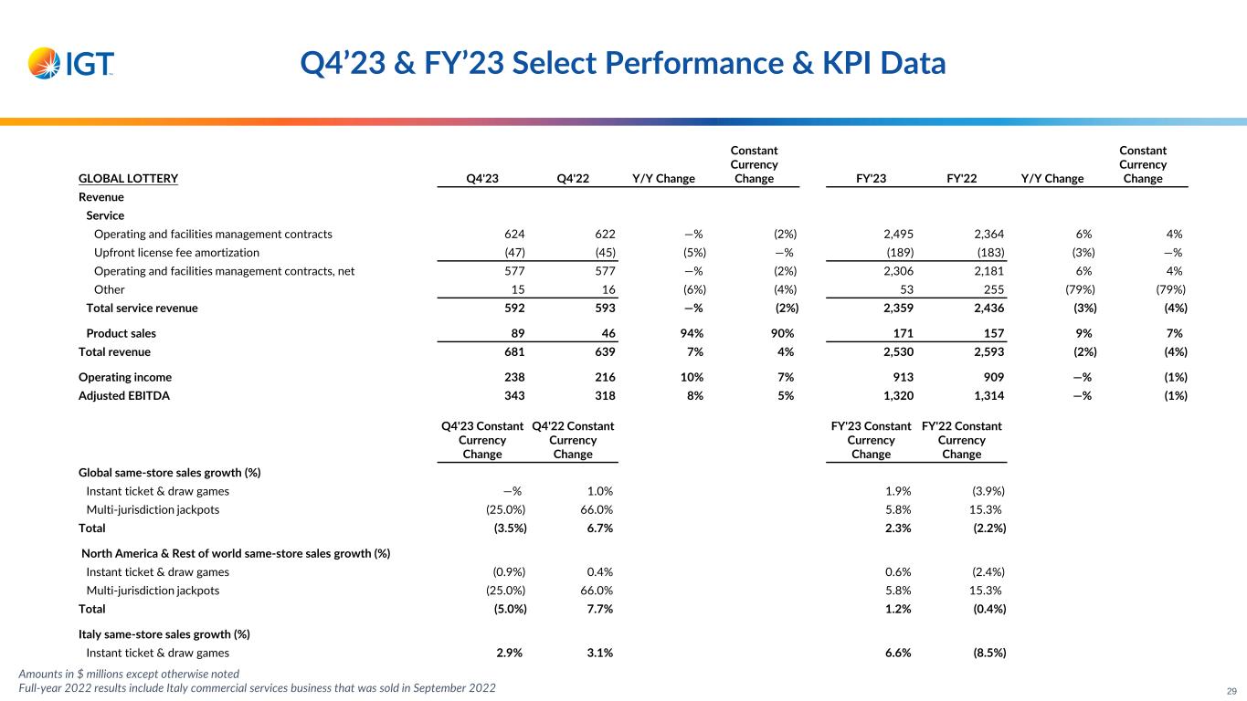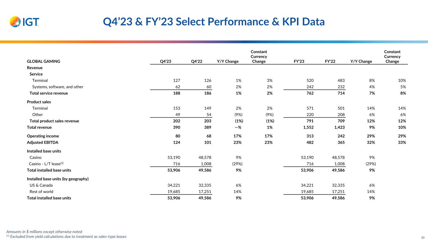 Amounts in $ millions except otherwise noted Full-year 2022 results include Italy commercial services business that was sold in September 2022 GLOBAL LOTTERY Q4'23 Q4'22 Y/Y Change Constant Currency Change FY'23 FY'22 Y/Y Change Constant Currency Change Revenue Service Operating and facilities management contracts 624 622 —% (2%) 2,495 2,364 6% 4% Upfront license fee amortization (47) (45) (5%) —% (189) (183) (3%) —% Operating and facilities management contracts, net 577 577 —% (2%) 2,306 2,181 6% 4% Other 15 16 (6%) (4%) 53 255 (79%) (79%) Total service revenue 592 593 —% (2%) 2,359 2,436 (3%) (4%) Product sales 89 46 94% 90% 171 157 9% 7% Total revenue 681 639 7% 4% 2,530 2,593 (2%) (4%) Operating income 238 216 10% 7% 913 909 —% (1%) Adjusted EBITDA 343 318 8% 5% 1,320 1,314 —% (1%) Q4'23 Constant Currency Change Q4'22 Constant Currency Change FY'23 Constant Currency Change FY'22 Constant Currency Change Global same-store sales growth (%) Instant ticket & draw games —% 1.0% 1.9% (3.9%) Multi-jurisdiction jackpots (25.0%) 66.0% 5.8% 15.3% Total (3.5%) 6.7% 2.3% (2.2%) North America & Rest of world same-store sales growth (%) Instant ticket & draw games (0.9%) 0.4% 0.6% (2.4%) Multi-jurisdiction jackpots (25.0%) 66.0% 5.8% 15.3% Total (5.0%) 7.7% 1.2% (0.4%) Italy same-store sales growth (%) Instant ticket & draw games 2.9% 3.1% 6.6% (8.5%) Q4’23 & FY’23 Select Performance & KPI Data 29