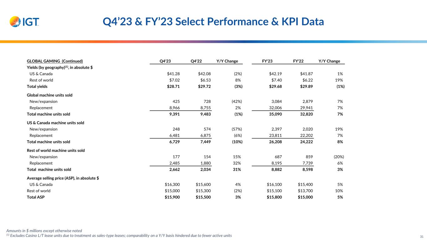 Amounts in $ millions except otherwise noted (1) Excluded from yield calculations due to treatment as sales-type leases GLOBAL GAMING Q4'23 Q4'22 Y/Y Change Constant Currency Change FY'23 FY'22 Y/Y Change Constant Currency Change Revenue Service Terminal 127 126 1% 3% 520 483 8% 10% Systems, software, and other 62 60 2% 2% 242 232 4% 5% Total service revenue 188 186 1% 2% 762 714 7% 8% Product sales Terminal 153 149 2% 2% 571 501 14% 14% Other 49 54 (9%) (9%) 220 208 6% 6% Total product sales revenue 202 203 (1%) (1%) 791 709 12% 12% Total revenue 390 389 —% 1% 1,552 1,423 9% 10% Operating income 80 68 17% 17% 313 242 29% 29% Adjusted EBITDA 124 101 23% 23% 482 365 32% 33% Installed base units Casino 53,190 48,578 9% 53,190 48,578 9% Casino - L/T lease(1) 716 1,008 (29%) 716 1,008 (29%) Total installed base units 53,906 49,586 9% 53,906 49,586 9% Installed base units (by geography) US & Canada 34,221 32,335 6% 34,221 32,335 6% Rest of world 19,685 17,251 14% 19,685 17,251 14% Total installed base units 53,906 49,586 9% 53,906 49,586 9% Q4’23 & FY’23 Select Performance & KPI Data 30