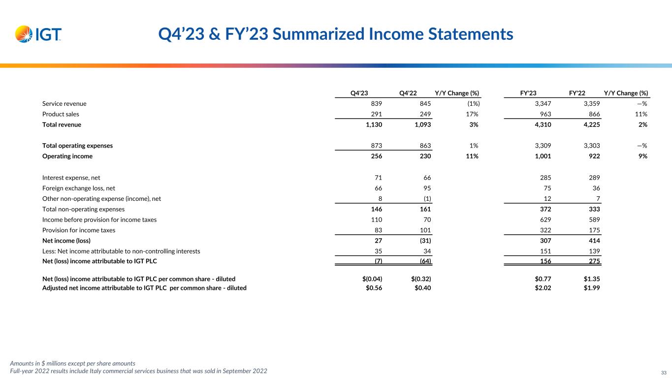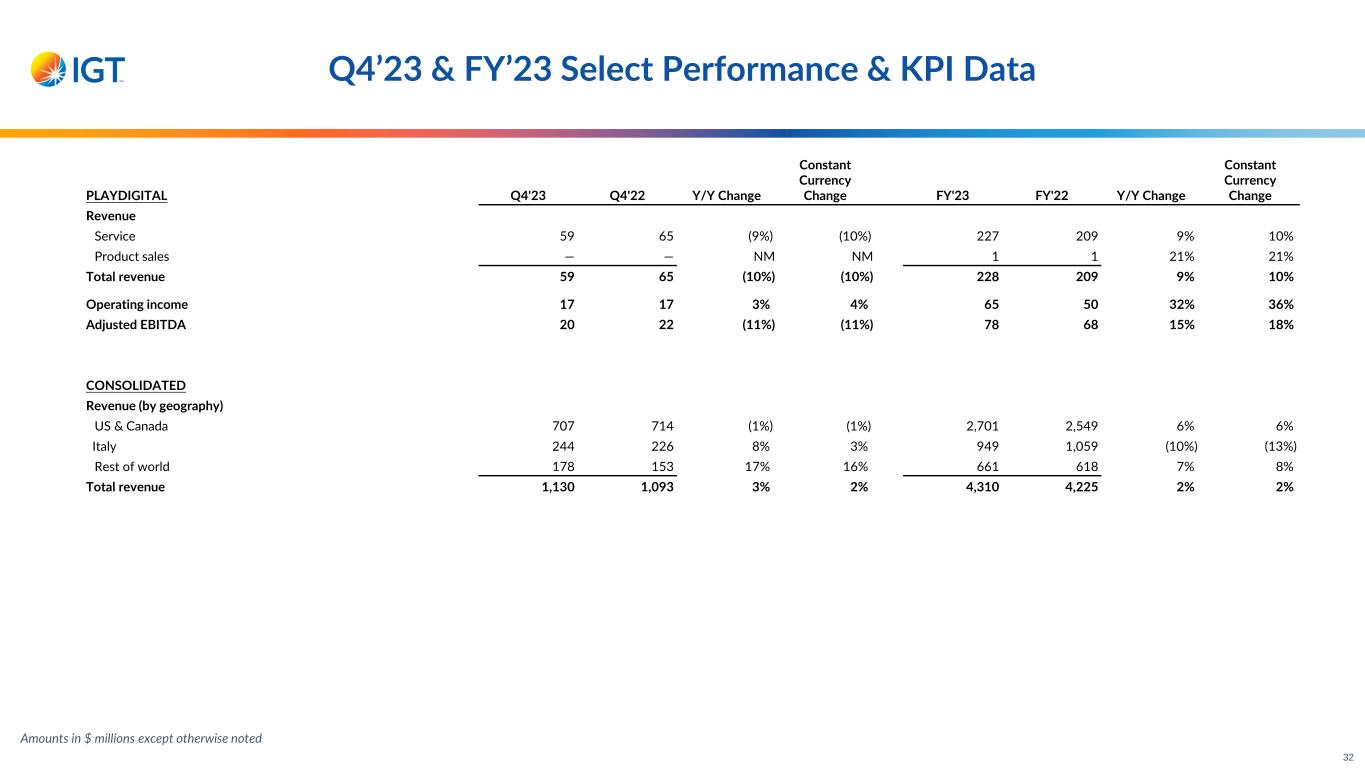 Amounts in $ millions except otherwise noted PLAYDIGITAL Q4'23 Q4'22 Y/Y Change Constant Currency Change FY'23 FY'22 Y/Y Change Constant Currency Change Revenue Service 59 65 (9%) (10%) 227 209 9% 10% Product sales — — NM NM 1 1 21% 21% Total revenue 59 65 (10%) (10%) 228 209 9% 10% Operating income 17 17 3% 4% 65 50 32% 36% Adjusted EBITDA 20 22 (11%) (11%) 78 68 15% 18% CONSOLIDATED Revenue (by geography) US & Canada 707 714 (1%) (1%) 2,701 2,549 6% 6% Italy 244 226 8% 3% 949 1,059 (10%) (13%) Rest of world 178 153 17% 16% 661 618 7% 8% Total revenue 1,130 1,093 3% 2% 4,310 4,225 2% 2% Q4’23 & FY’23 Select Performance & KPI Data 32