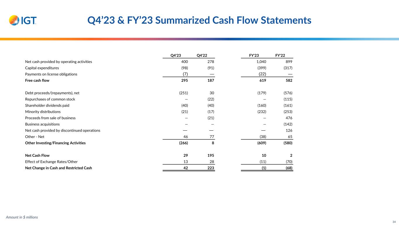 Amounts in $ millions except per share amounts Full-year 2022 results include Italy commercial services business that was sold in September 2022 Q4'23 Q4'22 Y/Y Change (%) FY'23 FY'22 Y/Y Change (%) Service revenue 839 845 (1%) 3,347 3,359 —% Product sales 291 249 17% 963 866 11% Total revenue 1,130 1,093 3% 4,310 4,225 2% Total operating expenses 873 863 1% 3,309 3,303 —% Operating income 256 230 11% 1,001 922 9% Interest expense, net 71 66 285 289 Foreign exchange loss, net 66 95 75 36 Other non-operating expense (income), net 8 (1) 12 7 Total non-operating expenses 146 161 372 333 Income before provision for income taxes 110 70 629 589 Provision for income taxes 83 101 322 175 Net income (loss) 27 (31) 307 414 Less: Net income attributable to non-controlling interests 35 34 151 139 Net (loss) income attributable to IGT PLC (7) (64) 156 275 Net (loss) income attributable to IGT PLC per common share - diluted $(0.04) $(0.32) $0.77 $1.35 Adjusted net income attributable to IGT PLC per common share - diluted $0.56 $0.40 $2.02 $1.99 Q4’23 & FY’23 Summarized Income Statements 33