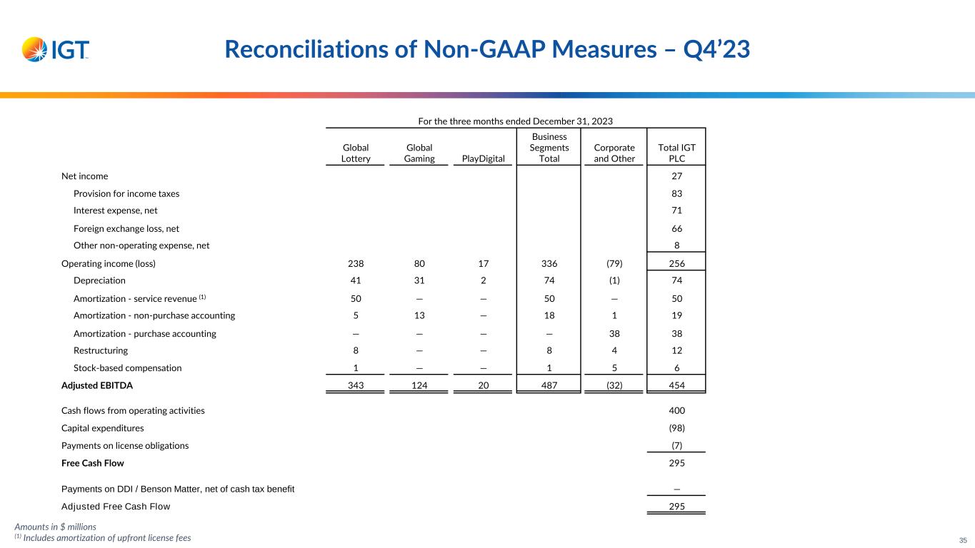 Amounts in $ millions (1) Includes amortization of upfront license fees For the three months ended December 31, 2023 Global Lottery Global Gaming PlayDigital Business Segments Total Corporate and Other Total IGT PLC Net income 27 Provision for income taxes 83 Interest expense, net 71 Foreign exchange loss, net 66 Other non-operating expense, net 8 Operating income (loss) 238 80 17 336 (79) 256 Depreciation 41 31 2 74 (1) 74 Amortization - service revenue (1) 50 — — 50 — 50 Amortization - non-purchase accounting 5 13 — 18 1 19 Amortization - purchase accounting — — — — 38 38 Restructuring 8 — — 8 4 12 Stock-based compensation 1 — — 1 5 6 Adjusted EBITDA 343 124 20 487 (32) 454 Cash flows from operating activities 400 Capital expenditures (98) Payments on license obligations (7) Free Cash Flow 295 Payments on DDI / Benson Matter, net of cash tax benefit — Adjusted Free Cash Flow 295 Reconciliations of Non-GAAP Measures – Q4’23 35