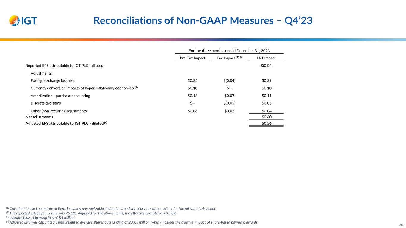 For the three months ended December 31, 2023 Pre-Tax Impact Tax Impact (1)(2) Net Impact Reported EPS attributable to IGT PLC - diluted $(0.04) Adjustments: Foreign exchange loss, net $0.25 $(0.04) $0.29 Currency conversion impacts of hyper-inflationary economies (3) $0.10 $— $0.10 Amortization - purchase accounting $0.18 $0.07 $0.11 Discrete tax items $— $(0.05) $0.05 Other (non-recurring adjustments) $0.06 $0.02 $0.04 Net adjustments $0.60 Adjusted EPS attributable to IGT PLC - diluted (4) $0.56 (1) Calculated based on nature of item, including any realizable deductions, and statutory tax rate in effect for the relevant jurisdiction (2) The reported effective tax rate was 75.3%. Adjusted for the above items, the effective tax rate was 35.8% (3) Includes blue-chip swap loss of $5 million (4) Adjusted EPS was calculated using weighted average shares outstanding of 203.3 million, which includes the dilutive impact of share-based payment awards Reconciliations of Non-GAAP Measures – Q4’23 36