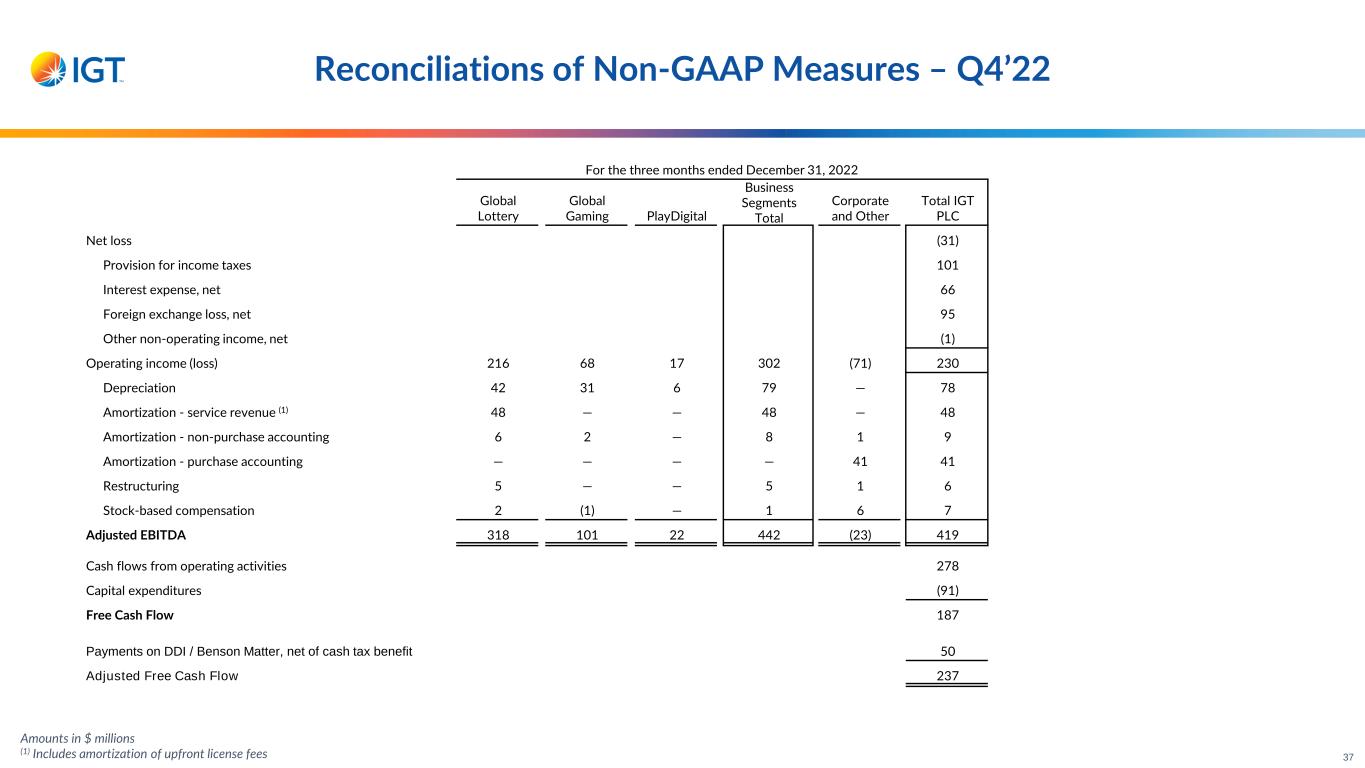 Amounts in $ millions (1) Includes amortization of upfront license fees For the three months ended December 31, 2022 Global Lottery Global Gaming PlayDigital Business Segments Total Corporate and Other Total IGT PLC Net loss (31) Provision for income taxes 101 Interest expense, net 66 Foreign exchange loss, net 95 Other non-operating income, net (1) Operating income (loss) 216 68 17 302 (71) 230 Depreciation 42 31 6 79 — 78 Amortization - service revenue (1) 48 — — 48 — 48 Amortization - non-purchase accounting 6 2 — 8 1 9 Amortization - purchase accounting — — — — 41 41 Restructuring 5 — — 5 1 6 Stock-based compensation 2 (1) — 1 6 7 Adjusted EBITDA 318 101 22 442 (23) 419 Cash flows from operating activities 278 Capital expenditures (91) Free Cash Flow 187 Payments on DDI / Benson Matter, net of cash tax benefit 50 Adjusted Free Cash Flow 237 Reconciliations of Non-GAAP Measures – Q4’22 37