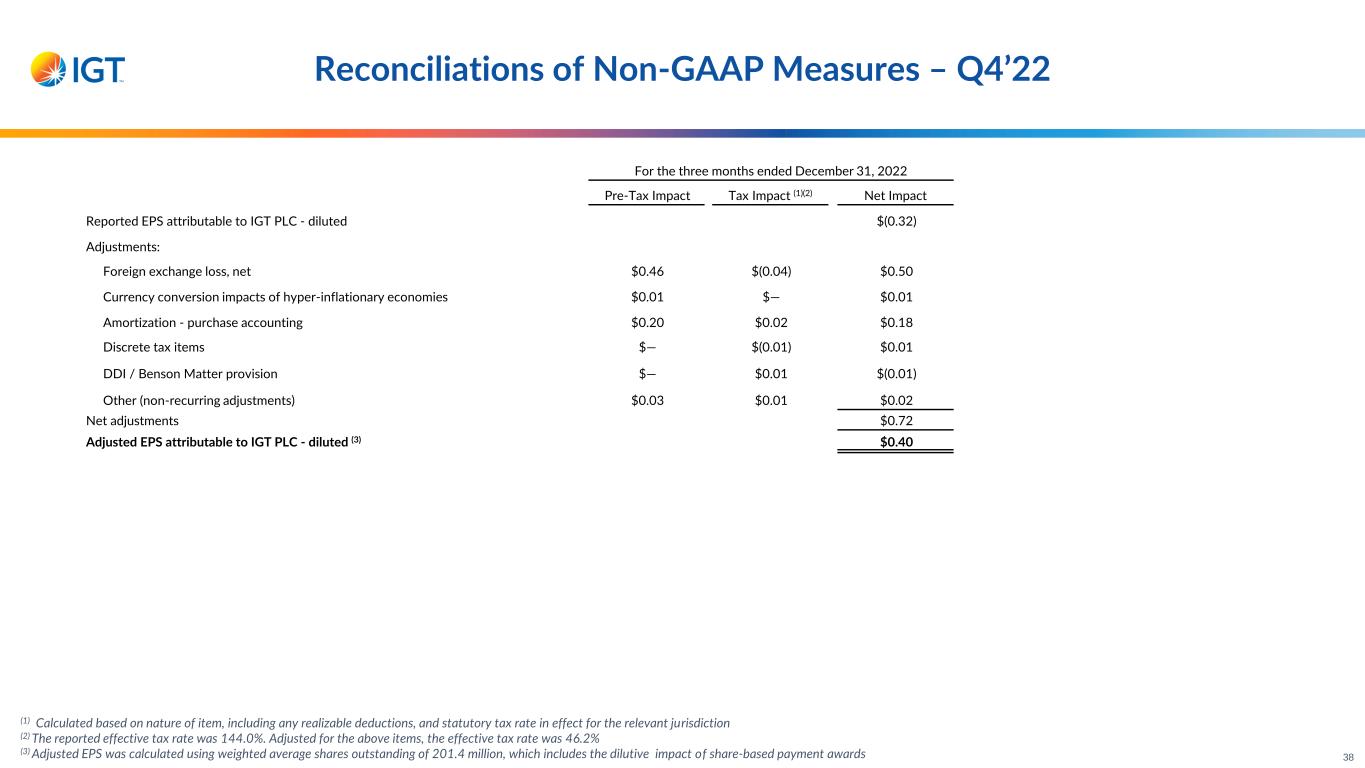 For the three months ended December 31, 2022 Pre-Tax Impact Tax Impact (1)(2) Net Impact Reported EPS attributable to IGT PLC - diluted $(0.32) Adjustments: Foreign exchange loss, net $0.46 $(0.04) $0.50 Currency conversion impacts of hyper-inflationary economies $0.01 $— $0.01 Amortization - purchase accounting $0.20 $0.02 $0.18 Discrete tax items $— $(0.01) $0.01 DDI / Benson Matter provision $— $0.01 $(0.01) Other (non-recurring adjustments) $0.03 $0.01 $0.02 Net adjustments $0.72 Adjusted EPS attributable to IGT PLC - diluted (3) $0.40 (1) Calculated based on nature of item, including any realizable deductions, and statutory tax rate in effect for the relevant jurisdiction (2) The reported effective tax rate was 144.0%. Adjusted for the above items, the effective tax rate was 46.2% (3) Adjusted EPS was calculated using weighted average shares outstanding of 201.4 million, which includes the dilutive impact of share-based payment awards Reconciliations of Non-GAAP Measures – Q4’22 38