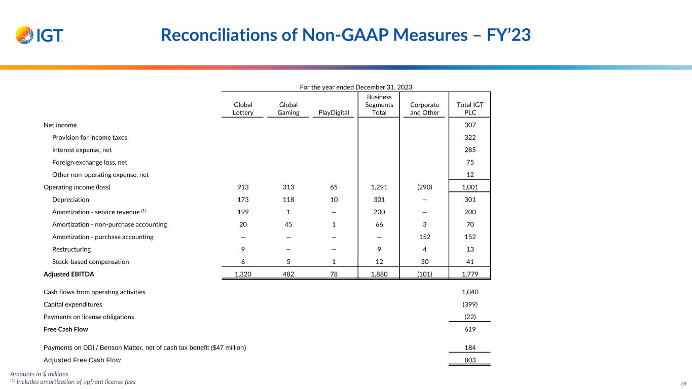 Amounts in $ millions (1) Includes amortization of upfront license fees For the year ended December 31, 2023 Global Lottery Global Gaming PlayDigital Business Segments Total Corporate and Other Total IGT PLC Net income 307 Provision for income taxes 322 Interest expense, net 285 Foreign exchange loss, net 75 Other non-operating expense, net 12 Operating income (loss) 913 313 65 1,291 (290) 1,001 Depreciation 173 118 10 301 — 301 Amortization - service revenue (1) 199 1 — 200 — 200 Amortization - non-purchase accounting 20 45 1 66 3 70 Amortization - purchase accounting — — — — 152 152 Restructuring 9 — — 9 4 13 Stock-based compensation 6 5 1 12 30 41 Adjusted EBITDA 1,320 482 78 1,880 (101) 1,779 Cash flows from operating activities 1,040 Capital expenditures (399) Payments on license obligations (22) Free Cash Flow 619 Payments on DDI / Benson Matter, net of cash tax benefit ($47 million) 184 Adjusted Free Cash Flow 803 Reconciliations of Non-GAAP Measures – FY’23 39