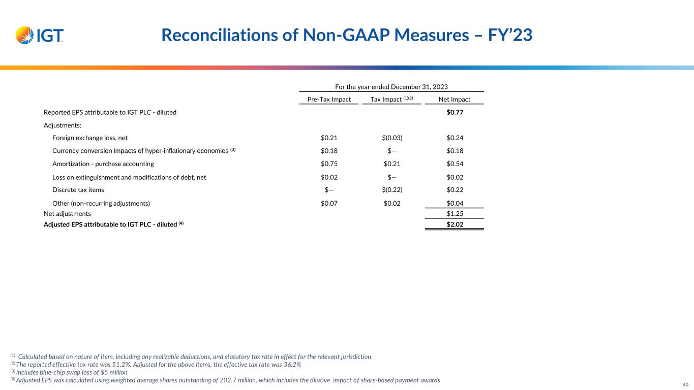 For the year ended December 31, 2023 Pre-Tax Impact Tax Impact (1)(2) Net Impact Reported EPS attributable to IGT PLC - diluted $0.77 Adjustments: Foreign exchange loss, net $0.21 $(0.03) $0.24 Currency conversion impacts of hyper-inflationary economies (3) $0.18 $— $0.18 Amortization - purchase accounting $0.75 $0.21 $0.54 Loss on extinguishment and modifications of debt, net $0.02 $— $0.02 Discrete tax items $— $(0.22) $0.22 Other (non-recurring adjustments) $0.07 $0.02 $0.04 Net adjustments $1.25 Adjusted EPS attributable to IGT PLC - diluted (4) $2.02 (1) Calculated based on nature of item, including any realizable deductions, and statutory tax rate in effect for the relevant jurisdiction (2) The reported effective tax rate was 51.2%. Adjusted for the above items, the effective tax rate was 36.2% (3) Includes blue-chip swap loss of $5 million (4) Adjusted EPS was calculated using weighted average shares outstanding of 202.7 million, which includes the dilutive impact of share-based payment awards Reconciliations of Non-GAAP Measures – FY’23 40