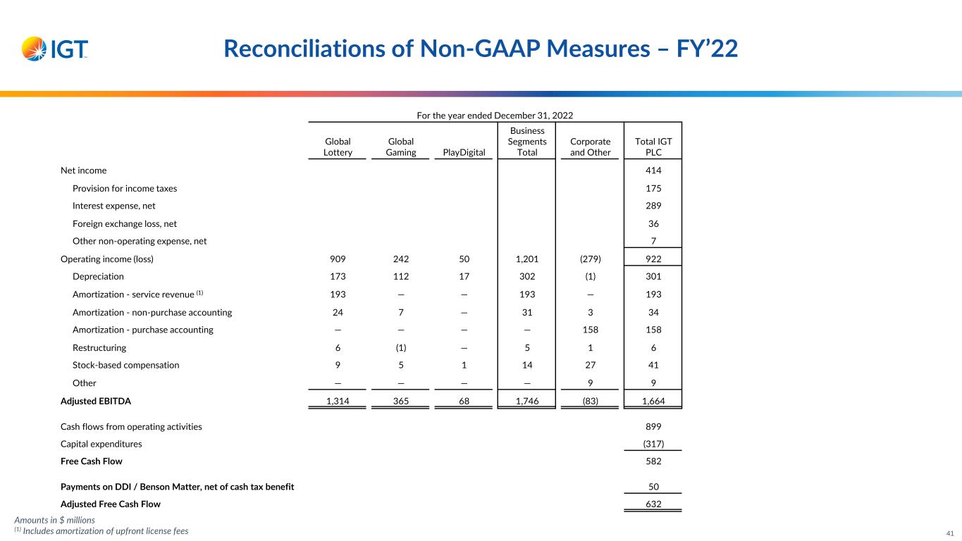 Amounts in $ millions (1) Includes amortization of upfront license fees For the year ended December 31, 2022 Global Lottery Global Gaming PlayDigital Business Segments Total Corporate and Other Total IGT PLC Net income 414 Provision for income taxes 175 Interest expense, net 289 Foreign exchange loss, net 36 Other non-operating expense, net 7 Operating income (loss) 909 242 50 1,201 (279) 922 Depreciation 173 112 17 302 (1) 301 Amortization - service revenue (1) 193 — — 193 — 193 Amortization - non-purchase accounting 24 7 — 31 3 34 Amortization - purchase accounting — — — — 158 158 Restructuring 6 (1) — 5 1 6 Stock-based compensation 9 5 1 14 27 41 Other — — — — 9 9 Adjusted EBITDA 1,314 365 68 1,746 (83) 1,664 Cash flows from operating activities 899 Capital expenditures (317) Free Cash Flow 582 Payments on DDI / Benson Matter, net of cash tax benefit 50 Adjusted Free Cash Flow 632 Reconciliations of Non-GAAP Measures – FY’22 41