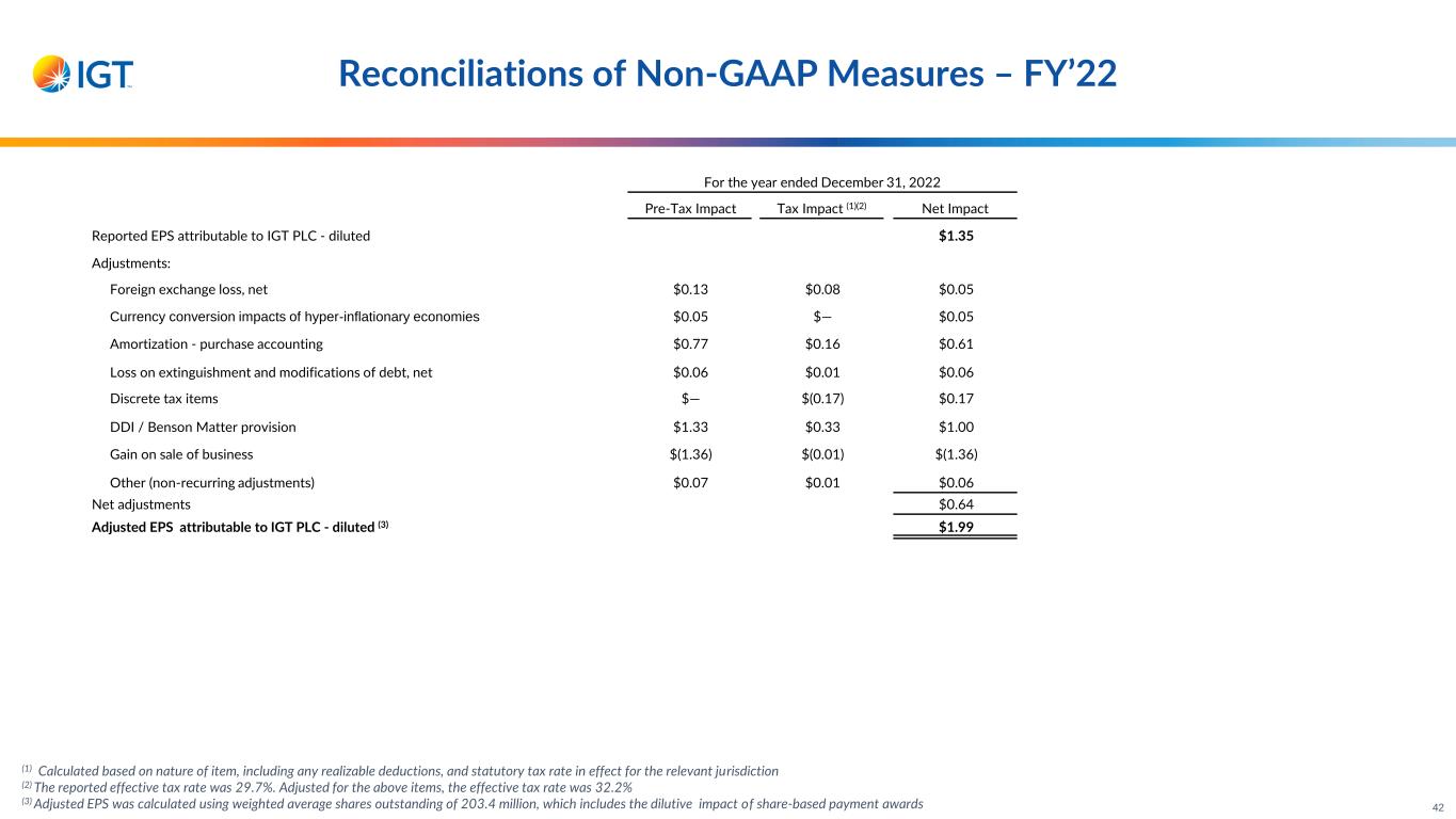 For the year ended December 31, 2022 Pre-Tax Impact Tax Impact (1)(2) Net Impact Reported EPS attributable to IGT PLC - diluted $1.35 Adjustments: Foreign exchange loss, net $0.13 $0.08 $0.05 Currency conversion impacts of hyper-inflationary economies $0.05 $— $0.05 Amortization - purchase accounting $0.77 $0.16 $0.61 Loss on extinguishment and modifications of debt, net $0.06 $0.01 $0.06 Discrete tax items $— $(0.17) $0.17 DDI / Benson Matter provision $1.33 $0.33 $1.00 Gain on sale of business $(1.36) $(0.01) $(1.36) Other (non-recurring adjustments) $0.07 $0.01 $0.06 Net adjustments $0.64 Adjusted EPS attributable to IGT PLC - diluted (3) $1.99 (1) Calculated based on nature of item, including any realizable deductions, and statutory tax rate in effect for the relevant jurisdiction (2) The reported effective tax rate was 29.7%. Adjusted for the above items, the effective tax rate was 32.2% (3) Adjusted EPS was calculated using weighted average shares outstanding of 203.4 million, which includes the dilutive impact of share-based payment awards Reconciliations of Non-GAAP Measures – FY’22 42