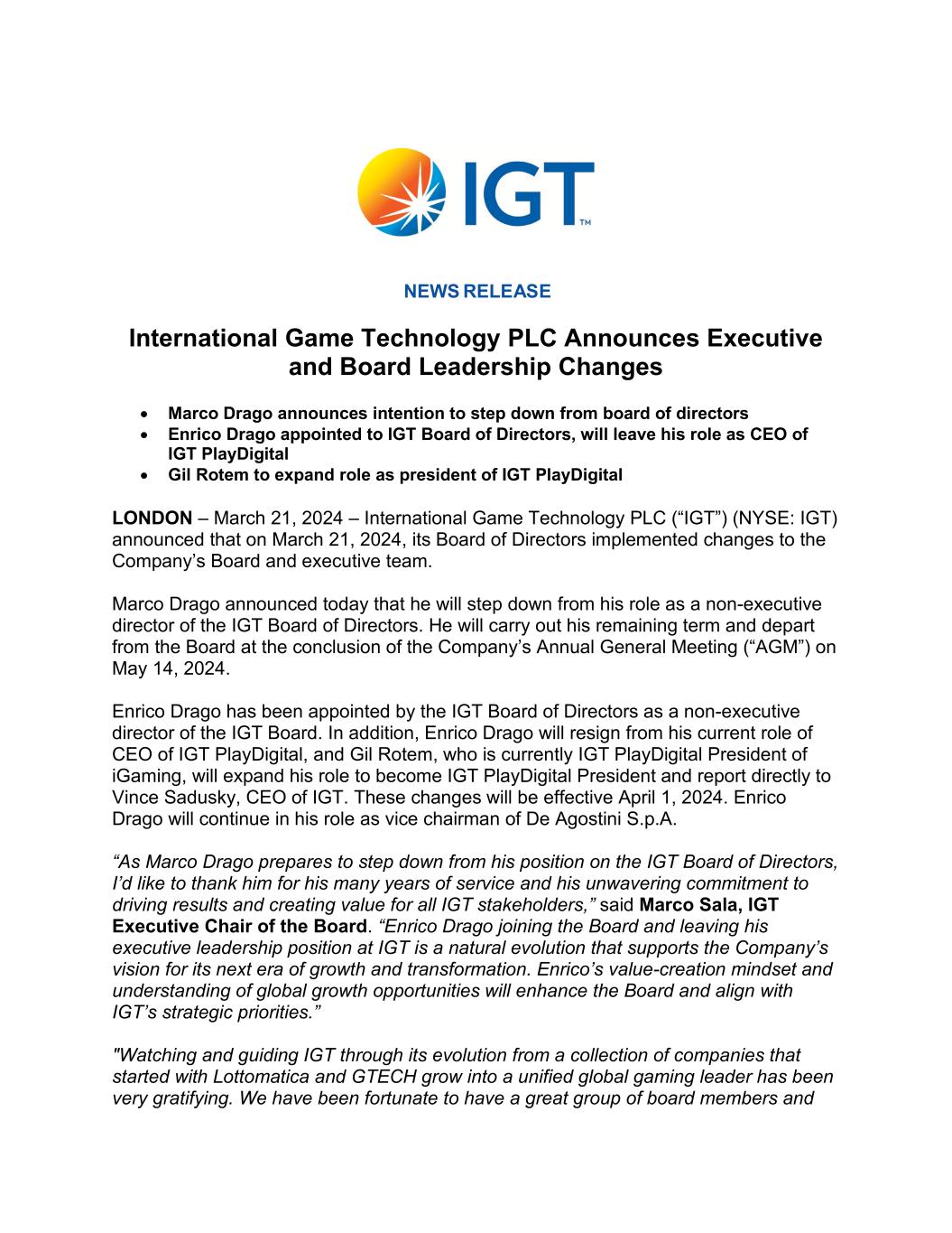 NEWS RELEASE International Game Technology PLC Announces Executive and Board Leadership Changes • Marco Drago announces intention to step down from board of directors • Enrico Drago appointed to IGT Board of Directors, will leave his role as CEO of IGT PlayDigital • Gil Rotem to expand role as president of IGT PlayDigital LONDON – March 21, 2024 – International Game Technology PLC (“IGT”) (NYSE: IGT) announced that on March 21, 2024, its Board of Directors implemented changes to the Company’s Board and executive team. Marco Drago announced today that he will step down from his role as a non-executive director of the IGT Board of Directors. He will carry out his remaining term and depart from the Board at the conclusion of the Company’s Annual General Meeting (“AGM”) on May 14, 2024. Enrico Drago has been appointed by the IGT Board of Directors as a non-executive director of the IGT Board. In addition, Enrico Drago will resign from his current role of CEO of IGT PlayDigital, and Gil Rotem, who is currently IGT PlayDigital President of iGaming, will expand his role to become IGT PlayDigital President and report directly to Vince Sadusky, CEO of IGT. These changes will be effective April 1, 2024. Enrico Drago will continue in his role as vice chairman of De Agostini S.p.A. “As Marco Drago prepares to step down from his position on the IGT Board of Directors, I’d like to thank him for his many years of service and his unwavering commitment to driving results and creating value for all IGT stakeholders,” said Marco Sala, IGT Executive Chair of the Board. “Enrico Drago joining the Board and leaving his executive leadership position at IGT is a natural evolution that supports the Company’s vision for its next era of growth and transformation. Enrico’s value-creation mindset and understanding of global growth opportunities will enhance the Board and align with IGT’s strategic priorities.” "Watching and guiding IGT through its evolution from a collection of companies that started with Lottomatica and GTECH grow into a unified global gaming leader has been very gratifying. We have been fortunate to have a great group of board members and
