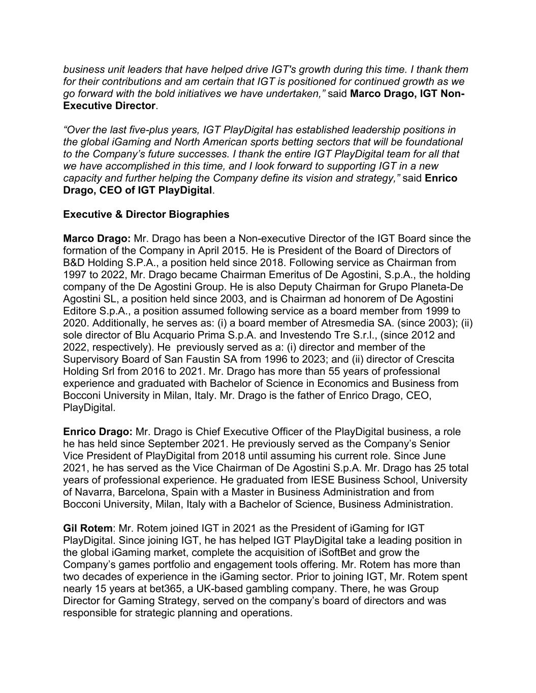 business unit leaders that have helped drive IGT's growth during this time. I thank them for their contributions and am certain that IGT is positioned for continued growth as we go forward with the bold initiatives we have undertaken,” said Marco Drago, IGT Non- Executive Director. “Over the last five-plus years, IGT PlayDigital has established leadership positions in the global iGaming and North American sports betting sectors that will be foundational to the Company’s future successes. I thank the entire IGT PlayDigital team for all that we have accomplished in this time, and I look forward to supporting IGT in a new capacity and further helping the Company define its vision and strategy,” said Enrico Drago, CEO of IGT PlayDigital. Executive & Director Biographies Marco Drago: Mr. Drago has been a Non-executive Director of the IGT Board since the formation of the Company in April 2015. He is President of the Board of Directors of B&D Holding S.P.A., a position held since 2018. Following service as Chairman from 1997 to 2022, Mr. Drago became Chairman Emeritus of De Agostini, S.p.A., the holding company of the De Agostini Group. He is also Deputy Chairman for Grupo Planeta-De Agostini SL, a position held since 2003, and is Chairman ad honorem of De Agostini Editore S.p.A., a position assumed following service as a board member from 1999 to 2020. Additionally, he serves as: (i) a board member of Atresmedia SA. (since 2003); (ii) sole director of Blu Acquario Prima S.p.A. and Investendo Tre S.r.l., (since 2012 and 2022, respectively). He previously served as a: (i) director and member of the Supervisory Board of San Faustin SA from 1996 to 2023; and (ii) director of Crescita Holding Srl from 2016 to 2021. Mr. Drago has more than 55 years of professional experience and graduated with Bachelor of Science in Economics and Business from Bocconi University in Milan, Italy. Mr. Drago is the father of Enrico Drago, CEO, PlayDigital. Enrico Drago: Mr. Drago is Chief Executive Officer of the PlayDigital business, a role he has held since September 2021. He previously served as the Company’s Senior Vice President of PlayDigital from 2018 until assuming his current role. Since June 2021, he has served as the Vice Chairman of De Agostini S.p.A. Mr. Drago has 25 total years of professional experience. He graduated from IESE Business School, University of Navarra, Barcelona, Spain with a Master in Business Administration and from Bocconi University, Milan, Italy with a Bachelor of Science, Business Administration. Gil Rotem: Mr. Rotem joined IGT in 2021 as the President of iGaming for IGT PlayDigital. Since joining IGT, he has helped IGT PlayDigital take a leading position in the global iGaming market, complete the acquisition of iSoftBet and grow the Company’s games portfolio and engagement tools offering. Mr. Rotem has more than two decades of experience in the iGaming sector. Prior to joining IGT, Mr. Rotem spent nearly 15 years at bet365, a UK-based gambling company. There, he was Group Director for Gaming Strategy, served on the company’s board of directors and was responsible for strategic planning and operations.