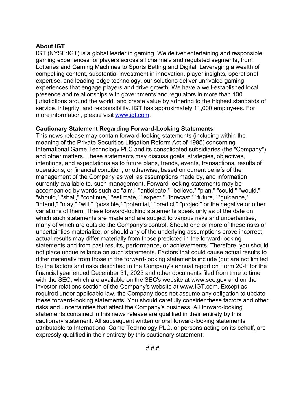 About IGT IGT (NYSE:IGT) is a global leader in gaming. We deliver entertaining and responsible gaming experiences for players across all channels and regulated segments, from Lotteries and Gaming Machines to Sports Betting and Digital. Leveraging a wealth of compelling content, substantial investment in innovation, player insights, operational expertise, and leading-edge technology, our solutions deliver unrivaled gaming experiences that engage players and drive growth. We have a well-established local presence and relationships with governments and regulators in more than 100 jurisdictions around the world, and create value by adhering to the highest standards of service, integrity, and responsibility. IGT has approximately 11,000 employees. For more information, please visit www.igt.com. Cautionary Statement Regarding Forward-Looking Statements This news release may contain forward-looking statements (including within the meaning of the Private Securities Litigation Reform Act of 1995) concerning International Game Technology PLC and its consolidated subsidiaries (the "Company") and other matters. These statements may discuss goals, strategies, objectives, intentions, and expectations as to future plans, trends, events, transactions, results of operations, or financial condition, or otherwise, based on current beliefs of the management of the Company as well as assumptions made by, and information currently available to, such management. Forward-looking statements may be accompanied by words such as "aim," "anticipate," "believe," "plan," "could," "would," "should," "shall," "continue," "estimate," "expect," "forecast," "future," "guidance," "intend," "may," "will," "possible," "potential," "predict," "project" or the negative or other variations of them. These forward-looking statements speak only as of the date on which such statements are made and are subject to various risks and uncertainties, many of which are outside the Company's control. Should one or more of these risks or uncertainties materialize, or should any of the underlying assumptions prove incorrect, actual results may differ materially from those predicted in the forward-looking statements and from past results, performance, or achievements. Therefore, you should not place undue reliance on such statements. Factors that could cause actual results to differ materially from those in the forward-looking statements include (but are not limited to) the factors and risks described in the Company's annual report on Form 20-F for the financial year ended December 31, 2023 and other documents filed from time to time with the SEC, which are available on the SEC's website at www.sec.gov and on the investor relations section of the Company's website at www.IGT.com. Except as required under applicable law, the Company does not assume any obligation to update these forward-looking statements. You should carefully consider these factors and other risks and uncertainties that affect the Company's business. All forward-looking statements contained in this news release are qualified in their entirety by this cautionary statement. All subsequent written or oral forward-looking statements attributable to International Game Technology PLC, or persons acting on its behalf, are expressly qualified in their entirety by this cautionary statement. # # #