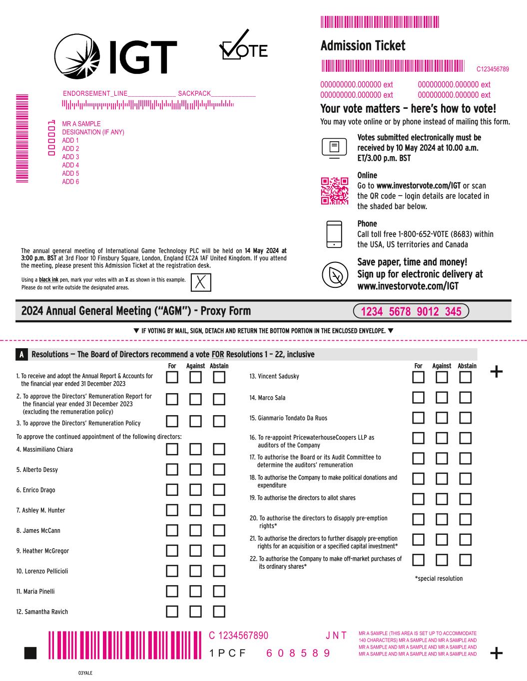 1 P C F To approve the continued appointment of the following directors: 13. Vincent Sadusky 14. Marco Sala 15. Gianmario Tondato Da Ruos For Against Abstain 16. To re-appoint PricewaterhouseCoopers LLP as auditors of the Company 4. Massimiliano Chiara 5. Alberto Dessy 6. Enrico Drago 7. Ashley M. Hunter 8. James McCann 9. Heather McGregor 10. Lorenzo Pellicioli 11. Maria Pinelli 12. Samantha Ravich Using a black ink pen, mark your votes with an X as shown in this example. Please do not write outside the designated areas. 03YALE + + q IF VOTING BY MAIL, SIGN, DETACH AND RETURN THE BOTTOM PORTION IN THE ENCLOSED ENVELOPE.q 2024 Annual General Meeting (“AGM”) - Proxy Form Resolutions — The Board of Directors recommend a vote FOR Resolutions 1 – 22, inclusiveA 1. To receive and adopt the Annual Report & Accounts for the financial year ended 31 December 2023 17. To authorise the Board or its Audit Committee to determine the auditors’ remuneration For Against Abstain *special resolution The annual general meeting of International Game Technology PLC will be held on 14 May 2024 at 3:00 p.m. BST at 3rd Floor 10 Finsbury Square, London, England EC2A 1AF United Kingdom. If you attend the meeting, please present this Admission Ticket at the registration desk. 18. To authorise the Company to make political donations and expenditure 19. To authorise the directors to allot shares 20. To authorise the directors to disapply pre-emption rights* 21. To authorise the directors to further disapply pre-emption rights for an acquisition or a specified capital investment* 22. To authorise the Company to make off-market purchases of its ordinary shares* 2. To approve the Directors’ Remuneration Report for the financial year ended 31 December 2023 (excluding the remuneration policy) 3. To approve the Directors’ Remuneration Policy Admission Ticket 1234 5678 9012 345 M M M M M M M M M 6 0 8 5 8 9 MR A SAMPLE (THIS AREA IS SET UP TO ACCOMMODATE 140 CHARACTERS) MR A SAMPLE AND MR A SAMPLE AND MR A SAMPLE AND MR A SAMPLE AND MR A SAMPLE AND MR A SAMPLE AND MR A SAMPLE AND MR A SAMPLE AND C 1234567890 J N T MMMMMMMMMMMM M MMMMMMM If no electronic voting, delete QR code and control # ∆ ≈ MMMMMMMMMMMMMMM 000000000.000000 ext 000000000.000000 ext 000000000.000000 ext 000000000.000000 ext C123456789 0 0 0 0 0 1 MR A SAMPLE DESIGNATION (IF ANY) ADD 1 ADD 2 ADD 3 ADD 4 ADD 5 ADD 6 ENDORSEMENT_LINE______________ SACKPACK_____________ You may vote online or by phone instead of mailing this form. Online Go to www.investorvote.com/IGT or scan the QR code — login details are located in the shaded bar below. Save paper, time and money! Sign up for electronic delivery at www.investorvote.com/IGT Phone Call toll free 1-800-652-VOTE (8683) within the USA, US territories and Canada Votes submitted electronically must be received by 10 May 2024 at 10.00 a.m. ET/3.00 p.m. BST Your vote matters – here’s how to vote!