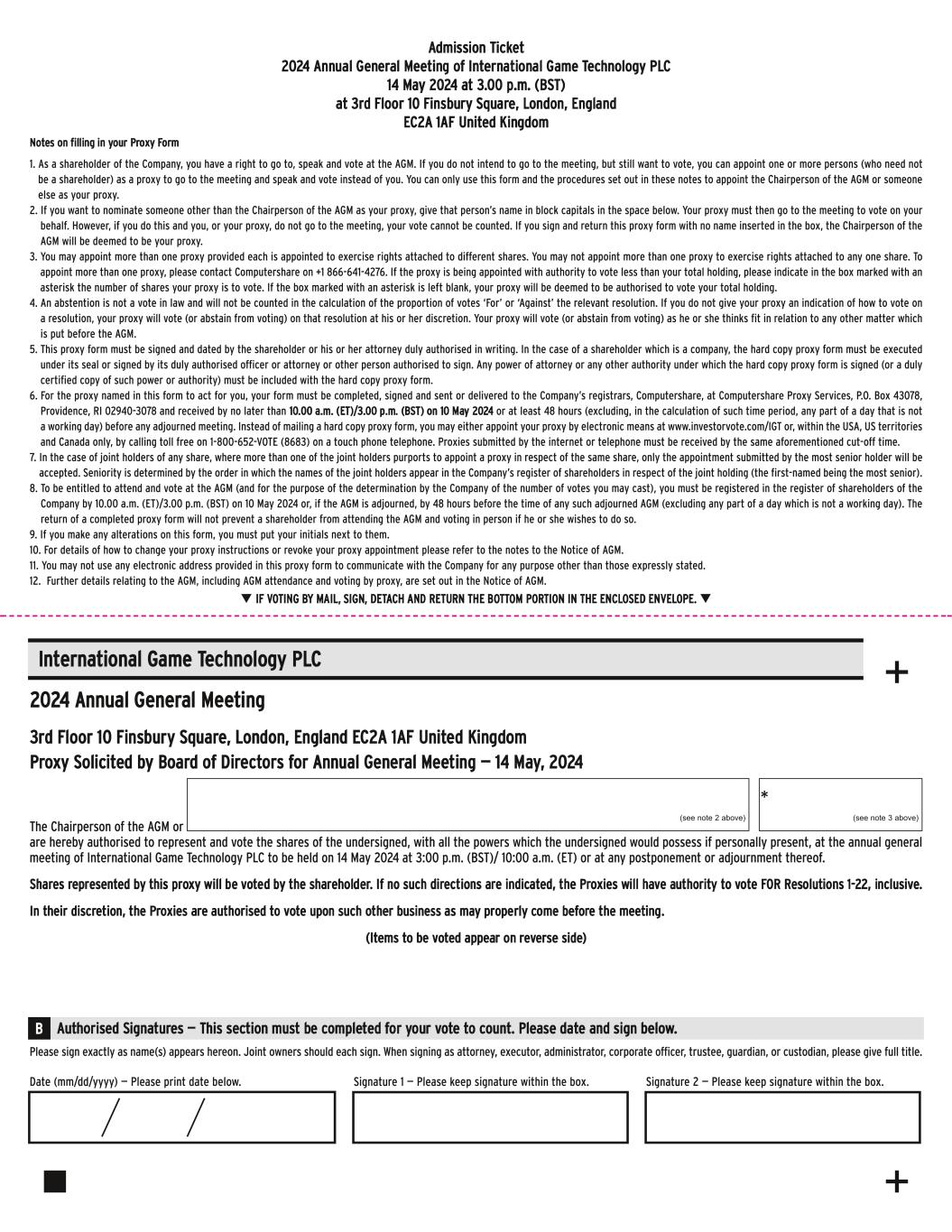 * International Game Technology PLC q IF VOTING BY MAIL, SIGN, DETACH AND RETURN THE BOTTOM PORTION IN THE ENCLOSED ENVELOPE.q + + Please sign exactly as name(s) appears hereon. Joint owners should each sign. When signing as attorney, executor, administrator, corporate officer, trustee, guardian, or custodian, please give full title. Signature 1 — Please keep signature within the box. Signature 2 — Please keep signature within the box.Date (mm/dd/yyyy) — Please print date below. Authorised Signatures — This section must be completed for your vote to count. Please date and sign below.B 2024 Annual General Meeting 3rd Floor 10 Finsbury Square, London, England EC2A 1AF United Kingdom Proxy Solicited by Board of Directors for Annual General Meeting — 14 May, 2024 The Chairperson of the AGM or are hereby authorised to represent and vote the shares of the undersigned, with all the powers which the undersigned would possess if personally present, at the annual general meeting of International Game Technology PLC to be held on 14 May 2024 at 3:00 p.m. (BST)/ 10:00 a.m. (ET) or at any postponement or adjournment thereof. Shares represented by this proxy will be voted by the shareholder. If no such directions are indicated, the Proxies will have authority to vote FOR Resolutions 1-22, inclusive. In their discretion, the Proxies are authorised to vote upon such other business as may properly come before the meeting. (Items to be voted appear on reverse side) (see note 2 above) (see note 3 above) Notes on filling in your Proxy Form 1. As a shareholder of the Company, you have a right to go to, speak and vote at the AGM. If you do not intend to go to the meeting, but still want to vote, you can appoint one or more persons (who need not be a shareholder) as a proxy to go to the meeting and speak and vote instead of you. You can only use this form and the procedures set out in these notes to appoint the Chairperson of the AGM or someone else as your proxy. 2. If you want to nominate someone other than the Chairperson of the AGM as your proxy, give that person’s name in block capitals in the space below. Your proxy must then go to the meeting to vote on your behalf. However, if you do this and you, or your proxy, do not go to the meeting, your vote cannot be counted. If you sign and return this proxy form with no name inserted in the box, the Chairperson of the AGM will be deemed to be your proxy. 3. You may appoint more than one proxy provided each is appointed to exercise rights attached to different shares. You may not appoint more than one proxy to exercise rights attached to any one share. To appoint more than one proxy, please contact Computershare on +1 866-641-4276. If the proxy is being appointed with authority to vote less than your total holding, please indicate in the box marked with an asterisk the number of shares your proxy is to vote. If the box marked with an asterisk is left blank, your proxy will be deemed to be authorised to vote your total holding. 4. An abstention is not a vote in law and will not be counted in the calculation of the proportion of votes ‘For’ or ‘Against’ the relevant resolution. If you do not give your proxy an indication of how to vote on a resolution, your proxy will vote (or abstain from voting) on that resolution at his or her discretion. Your proxy will vote (or abstain from voting) as he or she thinks fit in relation to any other matter which is put before the AGM. 5. This proxy form must be signed and dated by the shareholder or his or her attorney duly authorised in writing. In the case of a shareholder which is a company, the hard copy proxy form must be executed under its seal or signed by its duly authorised officer or attorney or other person authorised to sign. Any power of attorney or any other authority under which the hard copy proxy form is signed (or a duly certified copy of such power or authority) must be included with the hard copy proxy form. 6. For the proxy named in this form to act for you, your form must be completed, signed and sent or delivered to the Company’s registrars, Computershare, at Computershare Proxy Services, P.O. Box 43078, Providence, RI 02940-3078 and received by no later than 10.00 a.m. (ET)/3.00 p.m. (BST) on 10 May 2024 or at least 48 hours (excluding, in the calculation of such time period, any part of a day that is not a working day) before any adjourned meeting. Instead of mailing a hard copy proxy form, you may either appoint your proxy by electronic means at www.investorvote.com/lGT or, within the USA, US territories and Canada only, by calling toll free on 1-800-652-VOTE (8683) on a touch phone telephone. Proxies submitted by the internet or telephone must be received by the same aforementioned cut-off time. 7. In the case of joint holders of any share, where more than one of the joint holders purports to appoint a proxy in respect of the same share, only the appointment submitted by the most senior holder will be accepted. Seniority is determined by the order in which the names of the joint holders appear in the Company’s register of shareholders in respect of the joint holding (the first-named being the most senior). 8. To be entitled to attend and vote at the AGM (and for the purpose of the determination by the Company of the number of votes you may cast), you must be registered in the register of shareholders of the Company by 10.00 a.m. (ET)/3.00 p.m. (BST) on 10 May 2024 or, if the AGM is adjourned, by 48 hours before the time of any such adjourned AGM (excluding any part of a day which is not a working day). The return of a completed proxy form will not prevent a shareholder from attending the AGM and voting in person if he or she wishes to do so. 9. If you make any alterations on this form, you must put your initials next to them. 10. For details of how to change your proxy instructions or revoke your proxy appointment please refer to the notes to the Notice of AGM. 11. You may not 