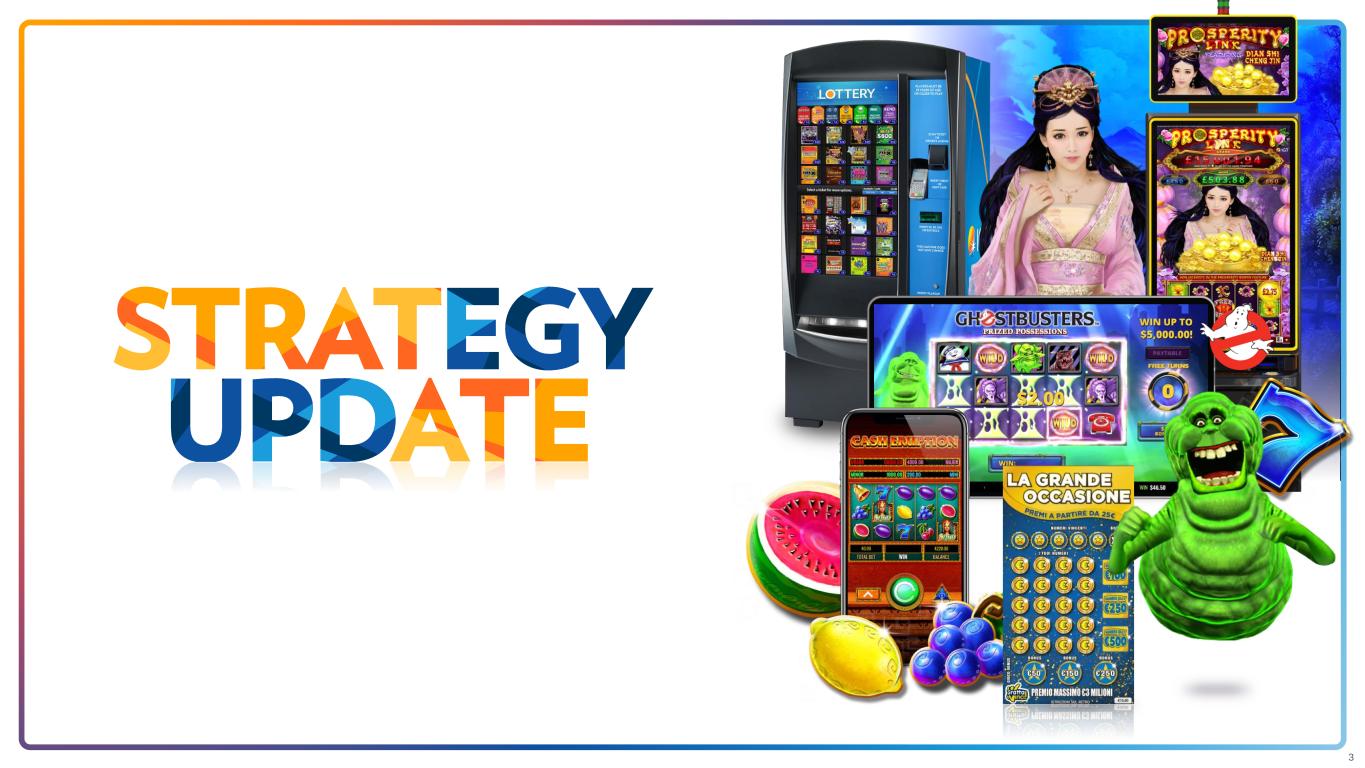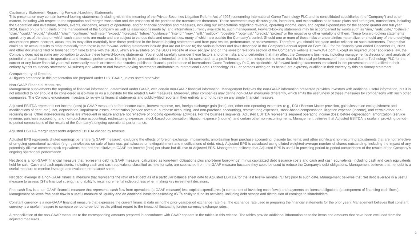 2 Cautionary Statement Regarding Forward-Looking Statements This presentation may contain forward-looking statements (including within the meaning of the Private Securities Litigation Reform Act of 1995) concerning International Game Technology PLC and its consolidated subsidiaries (the “Company”) and other matters, including with respect to the separation and merger transaction and the prospects of the parties to the transactions thereafter. These statements may discuss goals, intentions, and expectations as to future plans and strategies, transactions, including the Separation and divestiture, trends, events, dividends, results of operations, and/or financial condition and measures, including our expectations regarding revenue, operating income, cash, and capital expenditures for the second quarter and full year 2024, based on current beliefs of the management of the Company as well as assumptions made by, and information currently available to, such management. Forward-looking statements may be accompanied by words such as “aim,” “anticipate,” “believe,” “plan,” “could,” “would,” “should,” “shall”, “continue,” “estimate,” “expect,” “forecast,” “future,” “guidance,” “intend,” “may,” “will,” “outlook”, “possible,” “potential,” “predict,” “project” or the negative or other variations of them. These forward-looking statements speak only as of the date on which such statements are made and are subject to various risks and uncertainties, many of which are outside the Company’s control. Should one or more of these risks or uncertainties materialize, or should any of the underlying assumptions prove incorrect, actual results may differ materially from those predicted in the forward-looking statements and from past results, performance, or achievements. Therefore, you should not place undue reliance on such statements. Factors that could cause actual results to differ materially from those in the forward-looking statements include (but are not limited to) the various factors and risks described in the Company’s annual report on Form 20-F for the financial year ended December 31, 2023 and other documents filed or furnished from time to time with the SEC, which are available on the SEC’s website at www.sec.gov and on the investor relations section of the Company’s website at www.IGT.com. Except as required under applicable law, the Company does not assume any obligation to update these forward-looking statements. You should carefully consider these factors and other risks and uncertainties that may affect the Company’s business, including management’s discussion and analysis of potential or actual impacts to operations and financial performance. Nothing in this presentation is intended, or is to be construed, as a profit forecast or to be interpreted to mean that the financial performance of International Game Technology PLC for the current or any future financial years will necessarily match or exceed the historical published financial performance of International Game Technology PLC, as applicable. All forward-looking statements contained in this presentation are qualified in their entirety by this cautionary statement. All subsequent written or oral forward-looking statements attributable to International Game Technology PLC, or persons acting on its behalf, are expressly qualified in their entirety by this cautionary statement. Comparability of Results All figures presented in this presentation are prepared under U.S. GAAP, unless noted otherwise. Non-GAAP Financial Measures Management supplements the reporting of financial information, determined under GAAP, with certain non-GAAP financial information. Management believes the non-GAAP information presented provides investors with additional useful information, but it is not intended to nor should it be considered in isolation or as a substitute for the related GAAP measures. Moreover, other companies may define non-GAAP measures differently, which limits the usefulness of these measures for comparisons with such other companies. The Company encourages investors to review its financial statements and publicly-filed reports in their entirety and not to rely on any single financial measure. Adjusted EBITDA represents net income (loss) (a GAAP measure) before income taxes, interest expense, net, foreign exchange gain (loss), net, other non-operating expenses (e.g., DDI / Benson Matter provision, gains/losses on extinguishment and modifications of debt, etc.), net, depreciation, impairment losses, amortization (service revenue, purchase accounting, and non-purchase accounting), restructuring expenses, stock-based compensation, litigation expense (income), and certain other non- recurring items. Other non-recurring items are infrequent in nature and are not reflective of ongoing operational activities. For the business segments, Adjusted EBITDA represents segment operating income (loss) before depreciation, amortization (service revenue, purchase accounting, and non-purchase accounting), restructuring expenses, stock-based compensation, litigation expense (income), and certain other non-recurring items. Management believes that Adjusted EBITDA is useful in providing period- to-period comparisons of the results of the Company's ongoing operational performance. Adjusted EBITDA margin represents Adjusted EBITDA divided by revenue. Adjusted EPS represents diluted earnings per share (a GAAP measure), excluding the effects of foreign exchange, impairments, amortization from purchase accounting, discrete tax items, and other significant non-recurring adjustments that are not reflective of on-going operational activities (e.g., gains/losses on sale of business, gains/losses on extinguishment and modifications of debt, etc.). Adjusted EPS is calculated using diluted weighted-average number of shares outstanding, including the impact of any potentially d