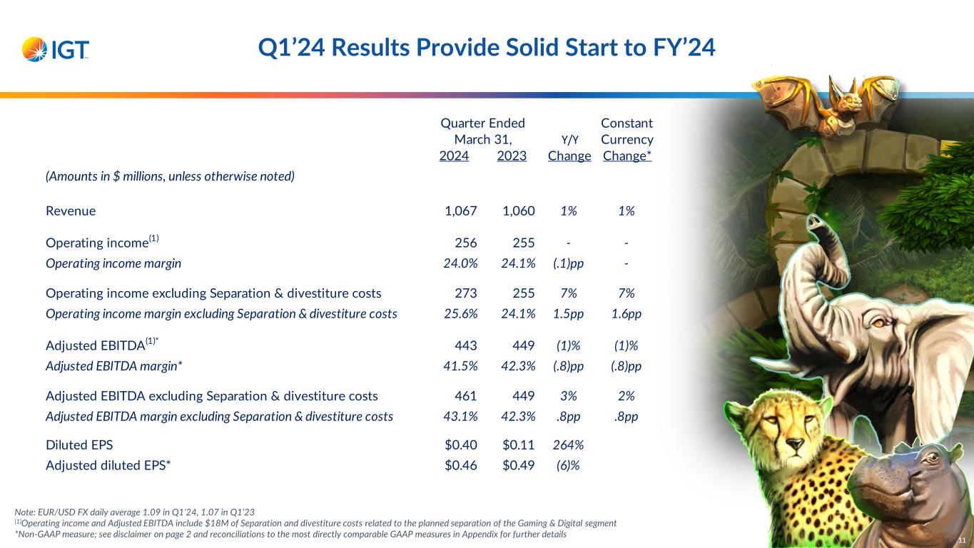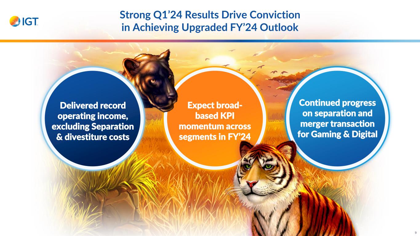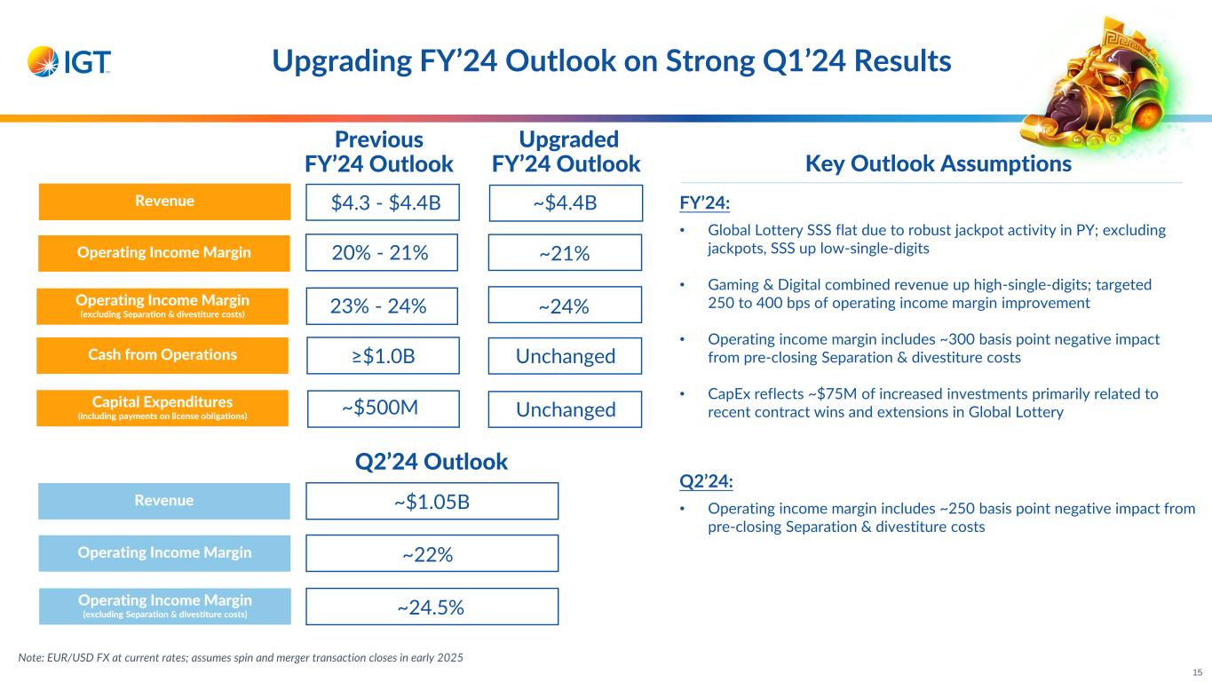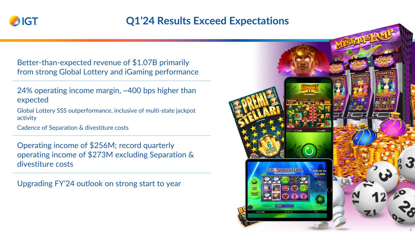 Q1’24 Results Exceed Expectations Better-than-expected revenue of $1.07B primarily from strong Global Lottery and iGaming performance 24% operating income margin, ~400 bps higher than expected Global Lottery SSS outperformance, inclusive of multi-state jackpot activity Cadence of Separation & divestiture costs Operating income of $256M; record quarterly operating income of $273M excluding Separation & divestiture costs Upgrading FY’24 outlook on strong start to year 4