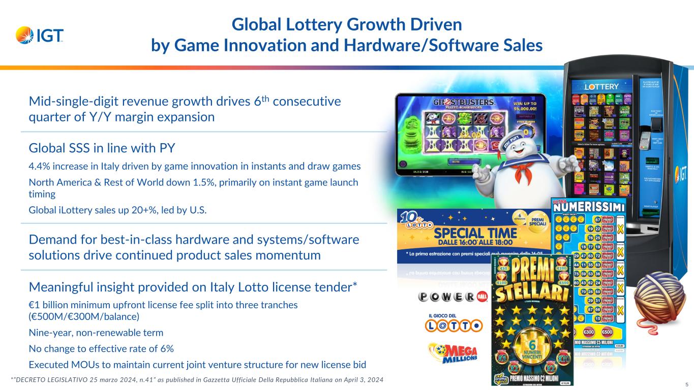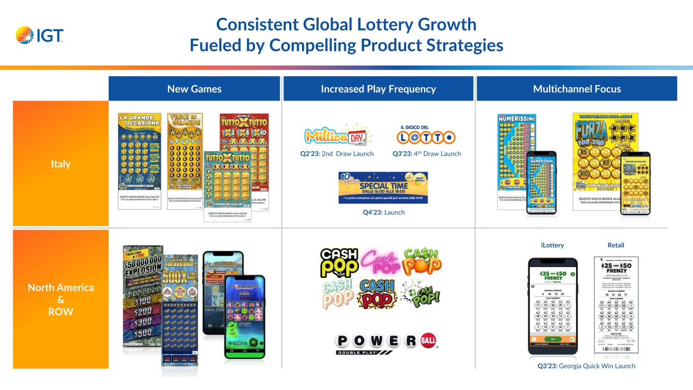 Consistent Global Lottery Growth Fueled by Compelling Product Strategies Italy North America & ROW New Games Increased Play Frequency Multichannel Focus Q4’23: Launch Q3’23: 4th Draw LaunchQ2’23: 2nd Draw Launch iLottery Retail Q3’23: Georgia Quick Win Launch