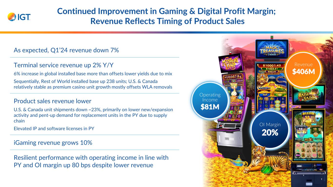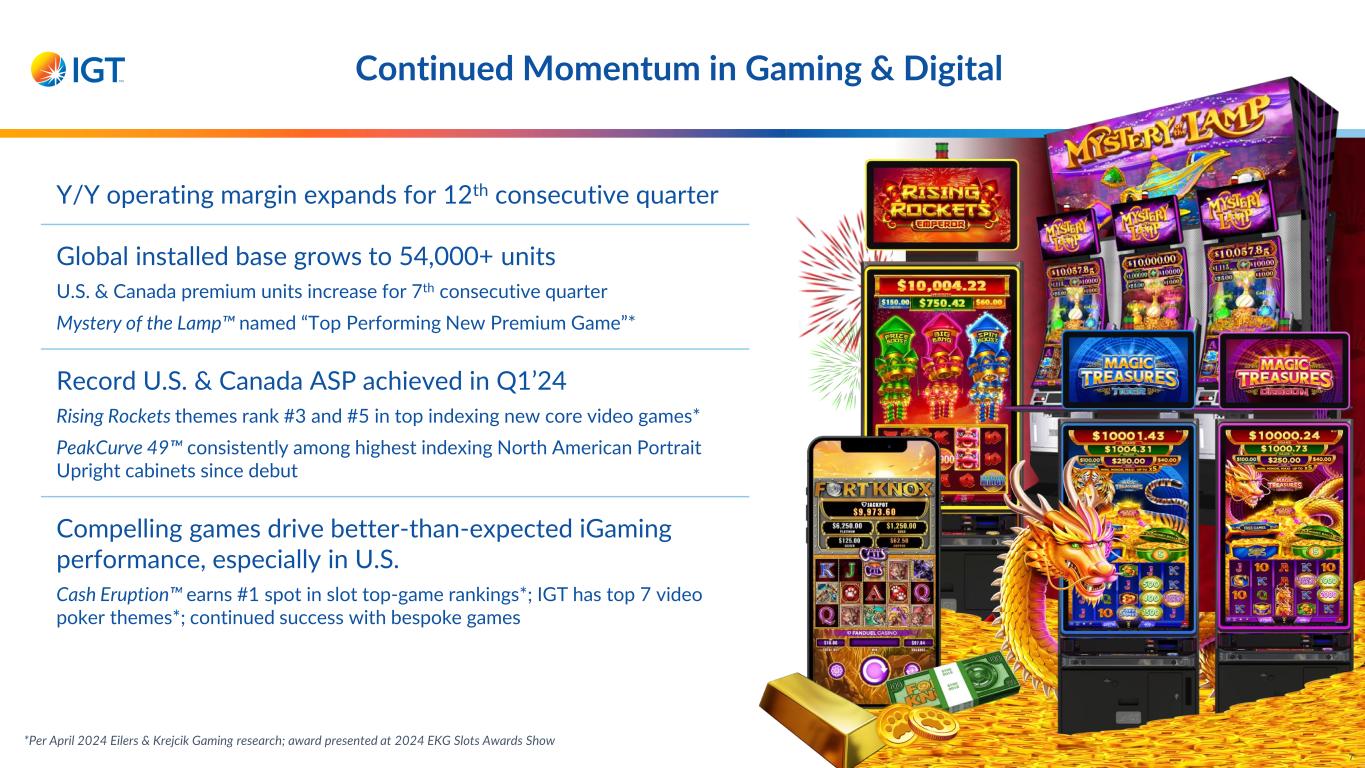 *Per April 2024 Eilers & Krejcik Gaming research; award presented at 2024 EKG Slots Awards Show Continued Momentum in Gaming & Digital 7 Y/Y operating margin expands for 12th consecutive quarter Global installed base grows to 54,000+ units U.S. & Canada premium units increase for 7th consecutive quarter Mystery of the Lamp named “Top Performing New Premium Game”* Record U.S. & Canada ASP achieved in Q1’24 Rising Rockets themes rank #3 and #5 in top indexing new core video games* PeakCurve 49 consistently among highest indexing North American Portrait Upright cabinets since debut Compelling games drive better-than-expected iGaming performance, especially in U.S. Cash Eruption earns #1 spot in slot top-game rankings*; IGT has top 7 video poker themes*; continued success with bespoke games