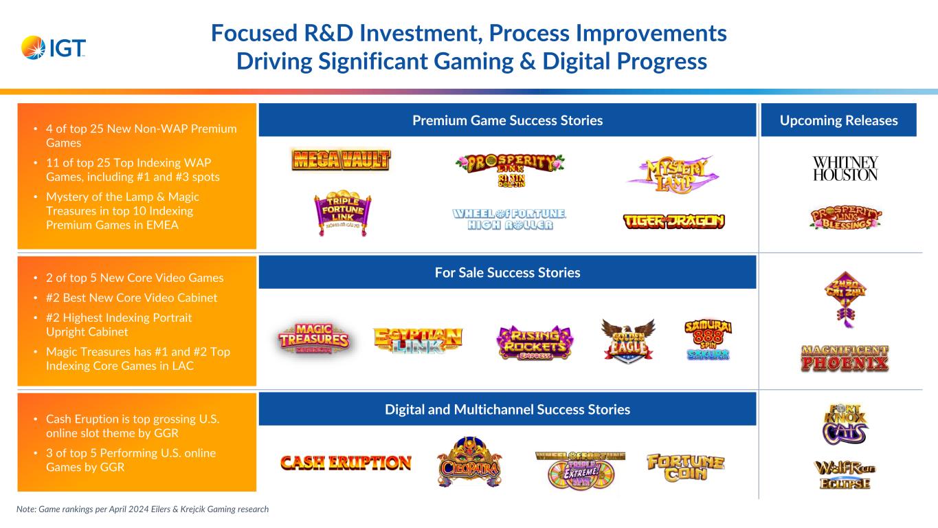 Upcoming Releases Focused R&D Investment, Process Improvements Driving Significant Gaming & Digital Progress • 4 of top 25 New Non-WAP Premium Games • 11 of top 25 Top Indexing WAP Games, including #1 and #3 spots • Mystery of the Lamp & Magic Treasures in top 10 Indexing Premium Games in EMEA Premium Game Success Stories • 2 of top 5 New Core Video Games • #2 Best New Core Video Cabinet • #2 Highest Indexing Portrait Upright Cabinet • Magic Treasures has #1 and #2 Top Indexing Core Games in LAC • Cash Eruption is top grossing U.S. online slot theme by GGR • 3 of top 5 Performing U.S. online Games by GGR For Sale Success Stories Digital and Multichannel Success Stories Note: Game rankings per April 2024 Eilers & Krejcik Gaming research