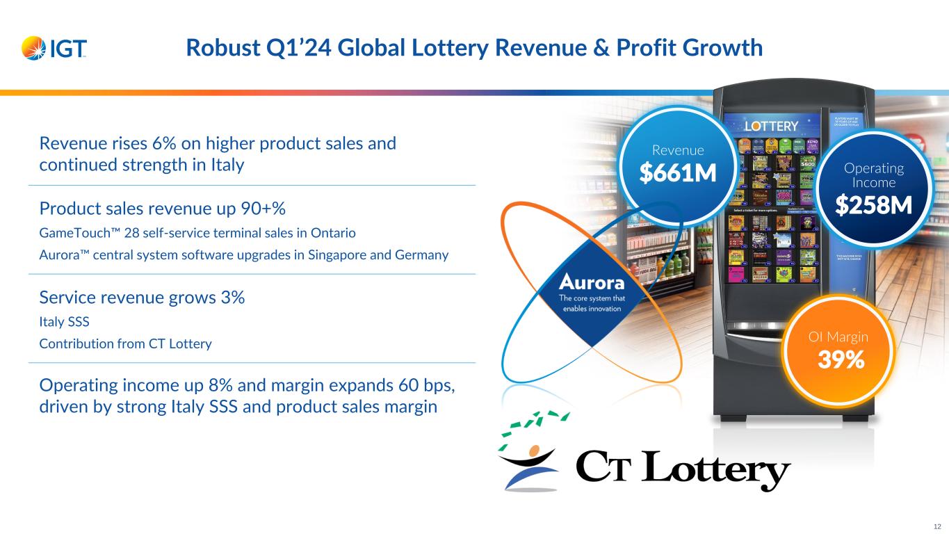 Robust Q1’24 Global Lottery Revenue & Profit Growth Revenue rises 6% on higher product sales and continued strength in Italy Product sales revenue up 90+% GameTouch 28 self-service terminal sales in Ontario Aurora central system software upgrades in Singapore and Germany Service revenue grows 3% Italy SSS Contribution from CT Lottery Operating income up 8% and margin expands 60 bps, driven by strong Italy SSS and product sales margin Operating Income $258M OI Margin 39% Revenue $661M 12