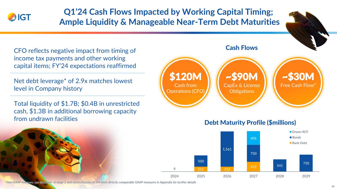 Continued Improvement in Gaming & Digital Profit Margin; Revenue Reflects Timing of Product Sales OI Margin 20% Operating Income $81M 13 Revenue $406M As expected, Q1’24 revenue down 7% Terminal service revenue up 2% Y/Y 6% increase in global installed base more than offsets lower yields due to mix Sequentially, Rest of World installed base up 238 units; U.S. & Canada relatively stable as premium casino unit growth mostly offsets WLA removals Product sales revenue lower U.S. & Canada unit shipments down ~23%, primarily on lower new/expansion activity and pent-up demand for replacement units in the PY due to supply chain Elevated IP and software licenses in PY iGaming revenue grows 10% Resilient performance with operating income in line with PY and OI margin up 80 bps despite lower revenue