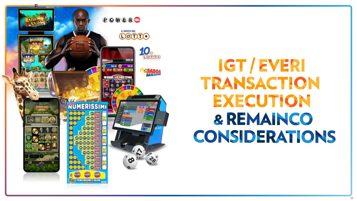 Revenue Operating Income Margin Cash from Operations Capital Expenditures (including payments on license obligations) Upgrading FY’24 Outlook on Strong Q1’24 Results Previous FY’24 Outlook $4.3 - $4.4B ~21% ≥$1.0B ~$500M Key Outlook Assumptions Q2’24 Outlook Revenue Operating Income Margin ~$1.05B ~22% 15 Note: EUR/USD FX at current rates; assumes spin and merger transaction closes in early 2025 FY’24: • Global Lottery SSS flat due to robust jackpot activity in PY; excluding jackpots, SSS up low-single-digits • Gaming & Digital combined revenue up high-single-digits; targeted 250 to 400 bps of operating income margin improvement • Operating income margin includes ~300 basis point negative impact from pre-closing Separation & divestiture costs • CapEx reflects ~$75M of increased investments primarily related to recent contract wins and extensions in Global Lottery Q2’24: • Operating income margin includes ~250 basis point negative impact from pre-closing Separation & divestiture costs Operating Income Margin (excluding Separation & divestiture costs) ~24% Operating Income Margin (excluding Separation & divestiture costs) ~24.5% Upgraded FY’24 Outlook ~$4.4B 20% - 21% 23% - 24% Unchanged Unchanged
