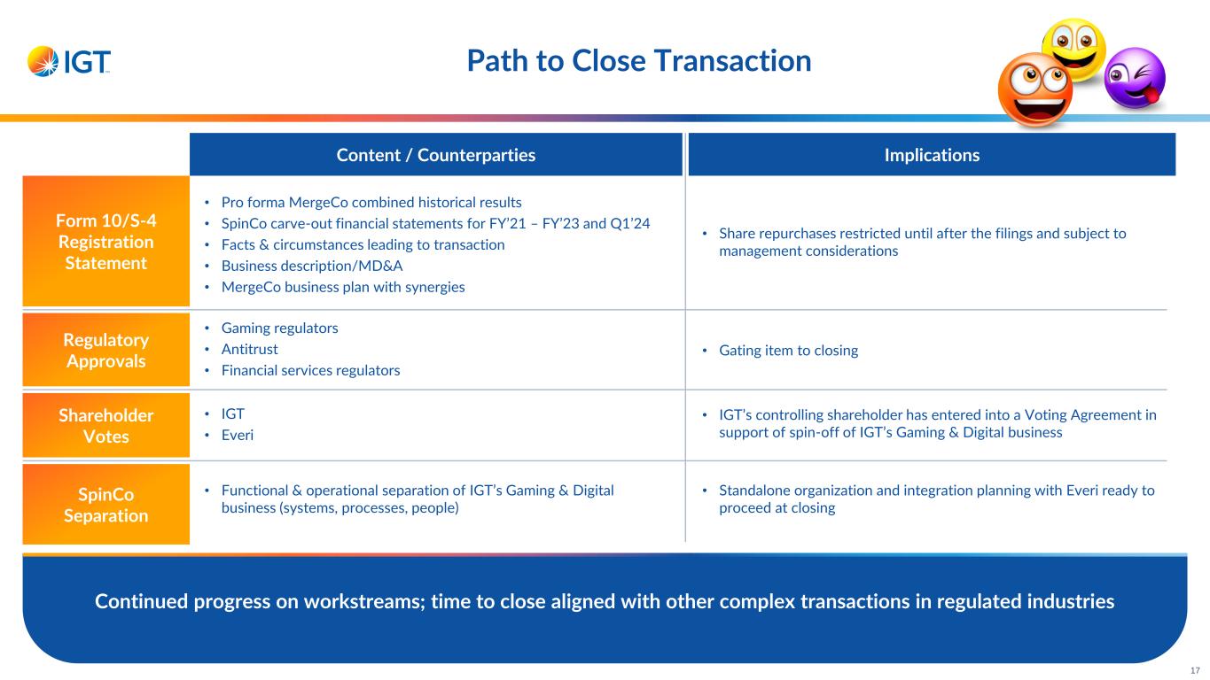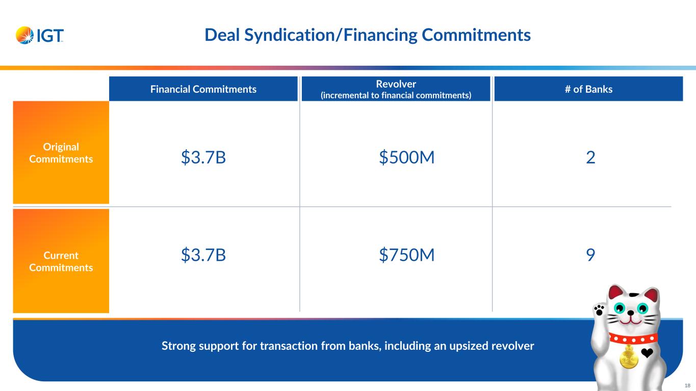 Path to Close Transaction 17 Form 10/S-4 Registration Statement Regulatory Approvals Shareholder Votes SpinCo Separation Continued progress on workstreams; time to close aligned with other complex transactions in regulated industries Content / Counterparties Implications • Pro forma MergeCo combined historical results • SpinCo carve-out financial statements for FY’21 – FY’23 and Q1’24 • Facts & circumstances leading to transaction • Business description/MD&A • MergeCo business plan with synergies • Gaming regulators • Antitrust • Financial services regulators • IGT • Everi • Functional & operational separation of IGT’s Gaming & Digital business (systems, processes, people) • Share repurchases restricted until after the filings and subject to management considerations • Gating item to closing • IGT’s controlling shareholder has entered into a Voting Agreement in support of spin-off of IGT’s Gaming & Digital business • Standalone organization and integration planning with Everi ready to proceed at closing
