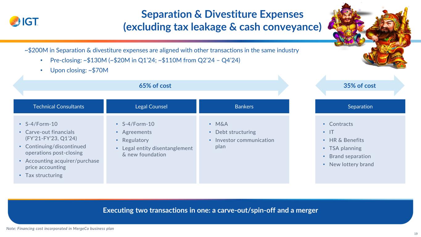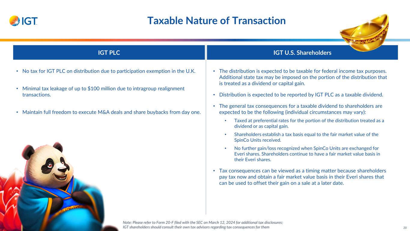 Separation & Divestiture Expenses (excluding tax leakage & cash conveyance) 19 ~$200M in Separation & divestiture expenses are aligned with other transactions in the same industry • Pre-closing: ~$130M (~$20M in Q1’24; ~$110M from Q2’24 – Q4’24) • Upon closing: ~$70M 65% of cost Technical Consultants Legal Counsel Bankers Note: Financing cost incorporated in MergeCo business plan 35% of cost Separation • S-4/Form-10 • Carve-out financials (FY’21-FY’23, Q1’24) • Continuing/discontinued operations post-closing • Accounting acquirer/purchase price accounting • Tax structuring • S-4/Form-10 • Agreements • Regulatory • Legal entity disentanglement & new foundation • M&A • Debt structuring • Investor communication plan • Contracts • IT • HR & Benefits • TSA planning • Brand separation • New lottery brand Executing two transactions in one: a carve-out/spin-off and a merger