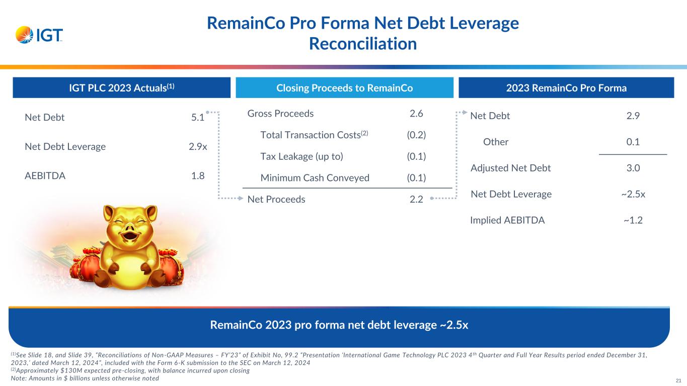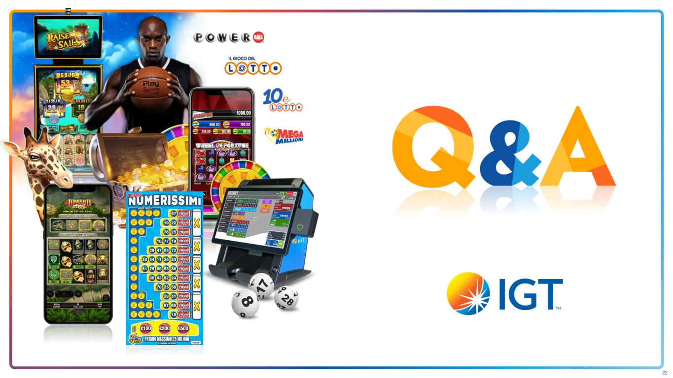 Net Debt 5.1 Net Debt Leverage 2.9x AEBITDA 1.8 RemainCo Pro Forma Net Debt Leverage Reconciliation (1)See Slide 18, and Slide 39, “Reconciliations of Non-GAAP Measures – FY’23” of Exhibit No, 99.2 “Presentation ‘International Game Technology PLC 2023 4th Quarter and Full Year Results period ended December 31, 2023,’ dated March 12, 2024”, included with the Form 6-K submission to the SEC on March 12, 2024 (2)Approximately $130M expected pre-closing, with balance incurred upon closing Note: Amounts in $ billions unless otherwise noted RemainCo 2023 pro forma net debt leverage ~2.5x IGT PLC 2023 Actuals(1) 2023 RemainCo Pro FormaClosing Proceeds to RemainCo Gross Proceeds 2.6 Total Transaction Costs(2) (0.2) Tax Leakage (up to) (0.1) Minimum Cash Conveyed (0.1) Net Proceeds 2.2 Net Debt 2.9 Other 0.1 Adjusted Net Debt 3.0 Net Debt Leverage ~2.5x Implied AEBITDA ~1.2 21