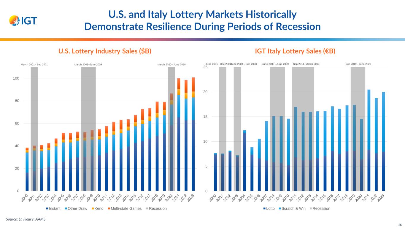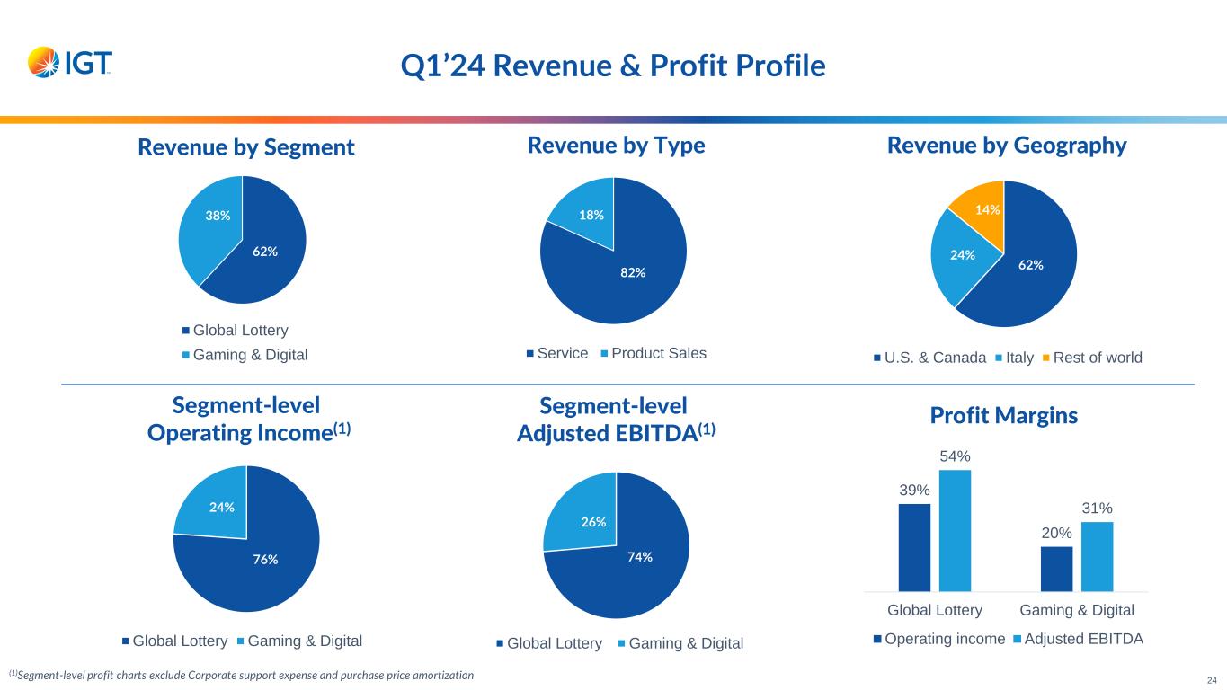 41% (1)Segment-level profit charts exclude Corporate support expense and purchase price amortization 62% 38% Global Lottery Gaming & Digital 82% 18% Service Product Sales 62% 24% 14% U.S. & Canada Italy Rest of world 76% 24% Global Lottery Gaming & Digital 74% 26% Global Lottery Gaming & Digital 39% 20% 54% 31% Global Lottery Gaming & Digital Operating income Adjusted EBITDA Revenue by Segment Revenue by Type Revenue by Geography Segment-level Operating Income(1) Segment-level Adjusted EBITDA(1) Profit Margins Q1’24 Revenue & Profit Profile 24