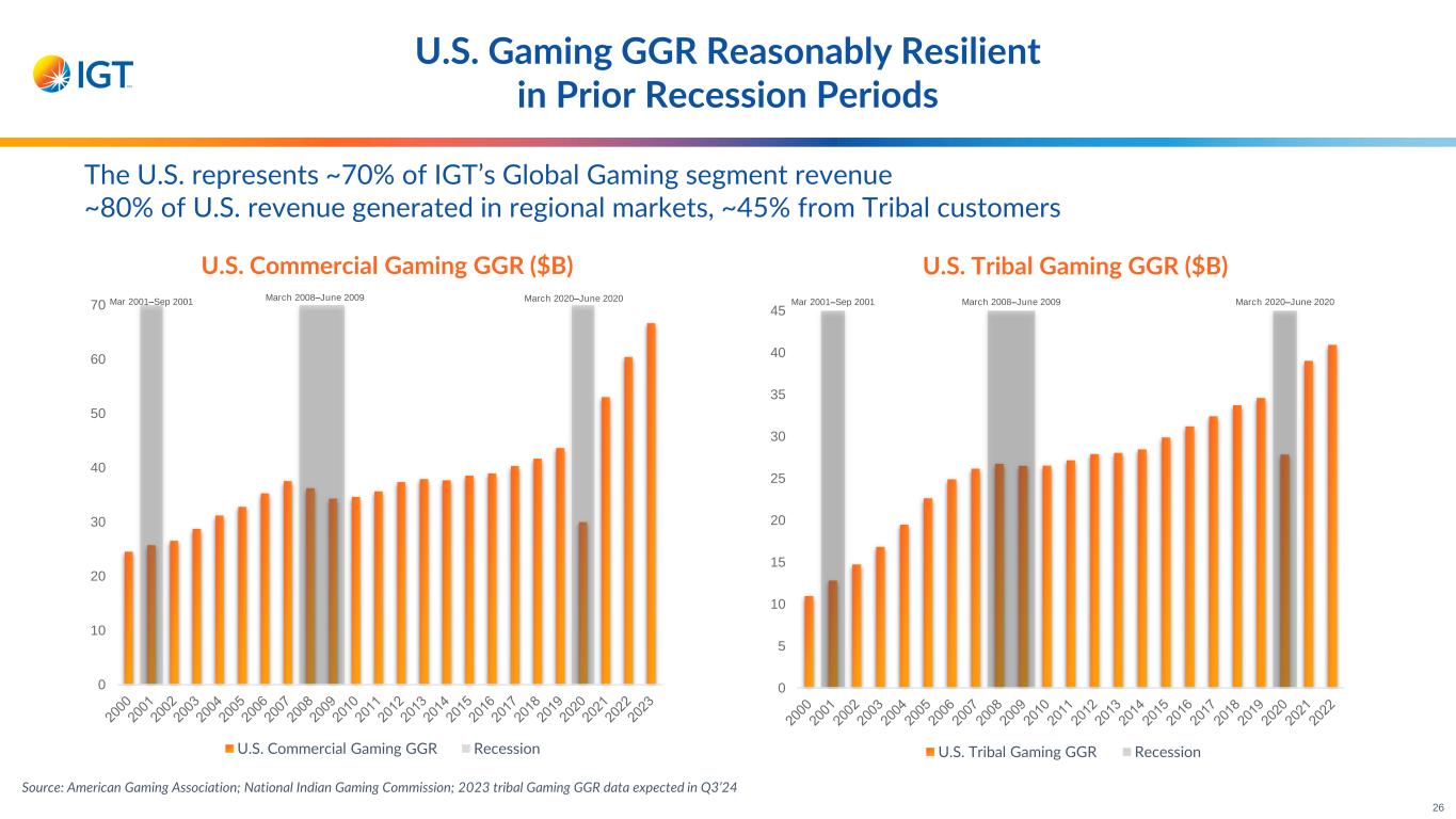 U.S. and Italy Lottery Markets Historically Demonstrate Resilience During Periods of Recession U.S. Lottery Industry Sales ($B) March 2001– Sep 2001 March 2008–June 2009 March 2020– June 2020 0 20 40 60 80 100 Instant Other Draw Keno Multi-state Games Recession IGT Italy Lottery Sales (€B) June 2001 - Dec 2001June 2003 – Sep 2003 June 2008 - June 2009 Sep 2011- March 2013 Dec 2019 - June 2020 0 5 10 15 20 25 Lotto Scratch & Win Recession Source: La Fleur’s; AAMS 25