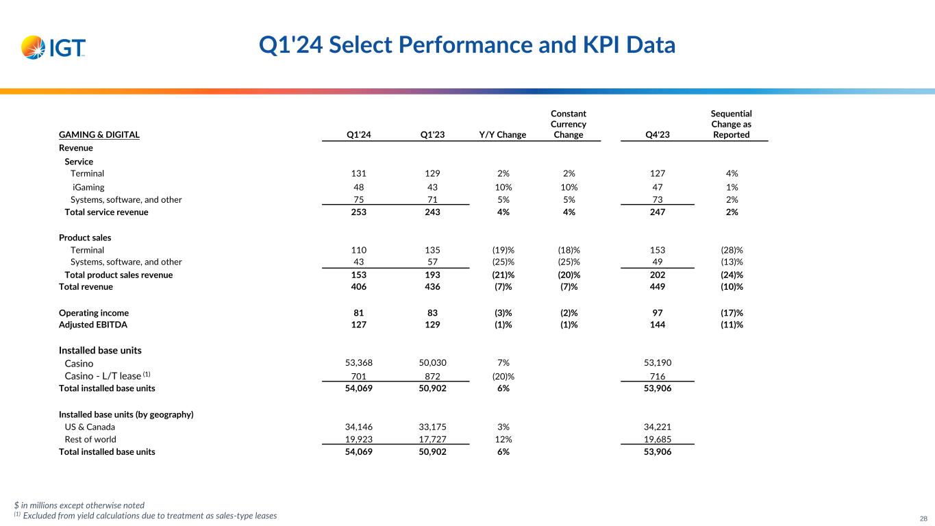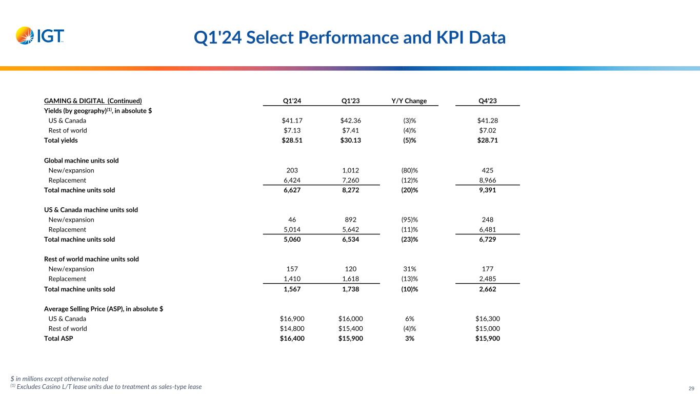 $ in millions except otherwise noted (1) Excluded from yield calculations due to treatment as sales-type leases Q1'24 Select Performance and KPI Data GAMING & DIGITAL Q1'24 Q1'23 Y/Y Change Constant Currency Change Q4'23 Sequential Change as Reported Revenue Service Terminal 131 129 2% 2% 127 4% iGaming 48 43 10% 10% 47 1% Systems, software, and other 75 71 5% 5% 73 2% Total service revenue 253 243 4% 4% 247 2% Product sales Terminal 110 135 (19)% (18)% 153 (28)% Systems, software, and other 43 57 (25)% (25)% 49 (13)% Total product sales revenue 153 193 (21)% (20)% 202 (24)% Total revenue 406 436 (7)% (7)% 449 (10)% Operating income 81 83 (3)% (2)% 97 (17)% Adjusted EBITDA 127 129 (1)% (1)% 144 (11)% Installed base units Casino 53,368 50,030 7% 53,190 Casino - L/T lease (1) 701 872 (20)% 716 Total installed base units 54,069 50,902 6% 53,906 Installed base units (by geography) US & Canada 34,146 33,175 3% 34,221 Rest of world 19,923 17,727 12% 19,685 Total installed base units 54,069 50,902 6% 53,906 28