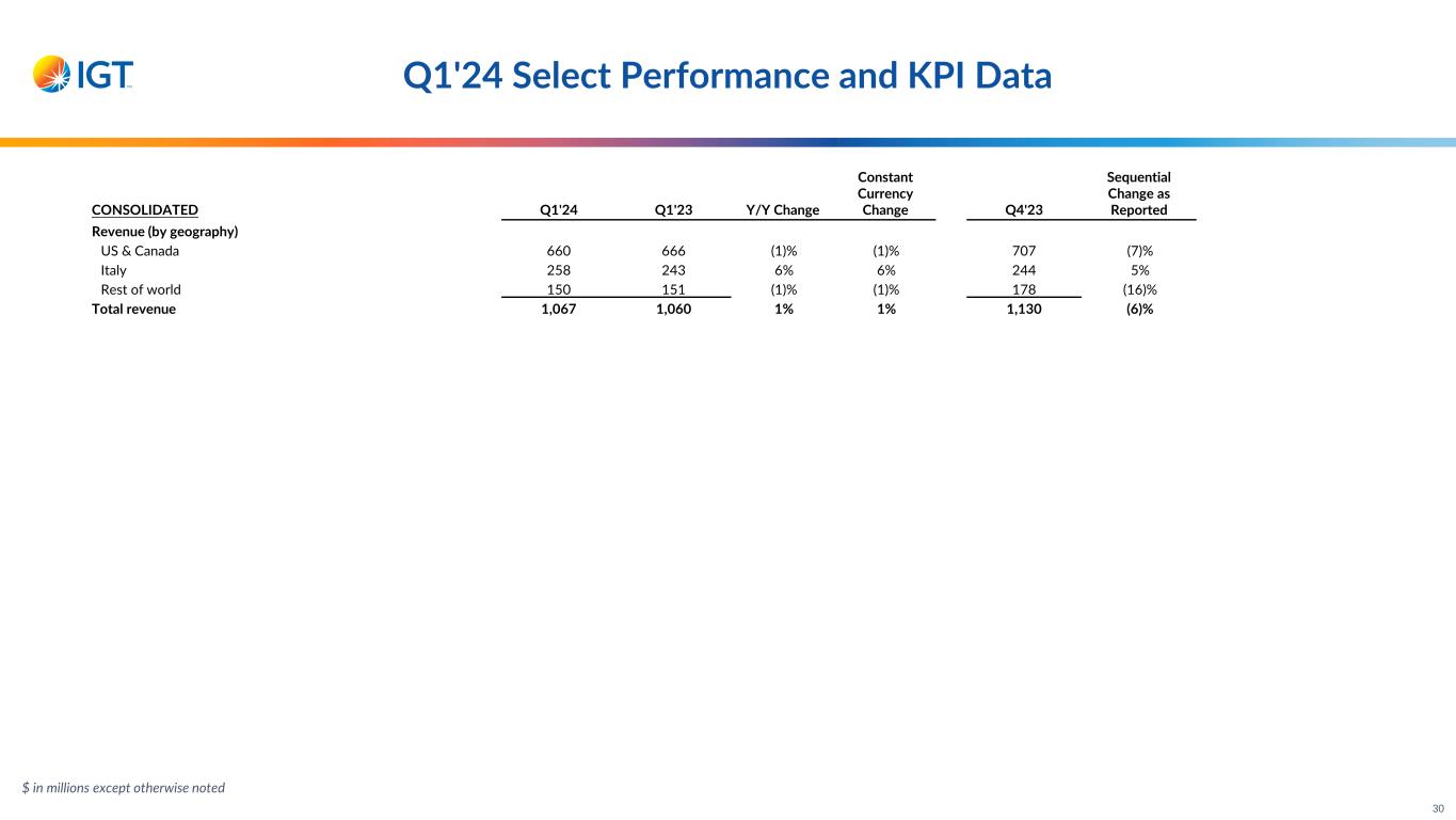 $ in millions except otherwise noted (1) Excludes Casino L/T lease units due to treatment as sales-type lease Q1'24 Select Performance and KPI Data GAMING & DIGITAL (Continued) Q1'24 Q1'23 Y/Y Change Q4'23 Yields (by geography)(1), in absolute $ US & Canada $41.17 $42.36 (3)% $41.28 Rest of world $7.13 $7.41 (4)% $7.02 Total yields $28.51 $30.13 (5)% $28.71 Global machine units sold New/expansion 203 1,012 (80)% 425 Replacement 6,424 7,260 (12)% 8,966 Total machine units sold 6,627 8,272 (20)% 9,391 US & Canada machine units sold New/expansion 46 892 (95)% 248 Replacement 5,014 5,642 (11)% 6,481 Total machine units sold 5,060 6,534 (23)% 6,729 Rest of world machine units sold New/expansion 157 120 31% 177 Replacement 1,410 1,618 (13)% 2,485 Total machine units sold 1,567 1,738 (10)% 2,662 Average Selling Price (ASP), in absolute $ US & Canada $16,900 $16,000 6% $16,300 Rest of world $14,800 $15,400 (4)% $15,000 Total ASP $16,400 $15,900 3% $15,900 29