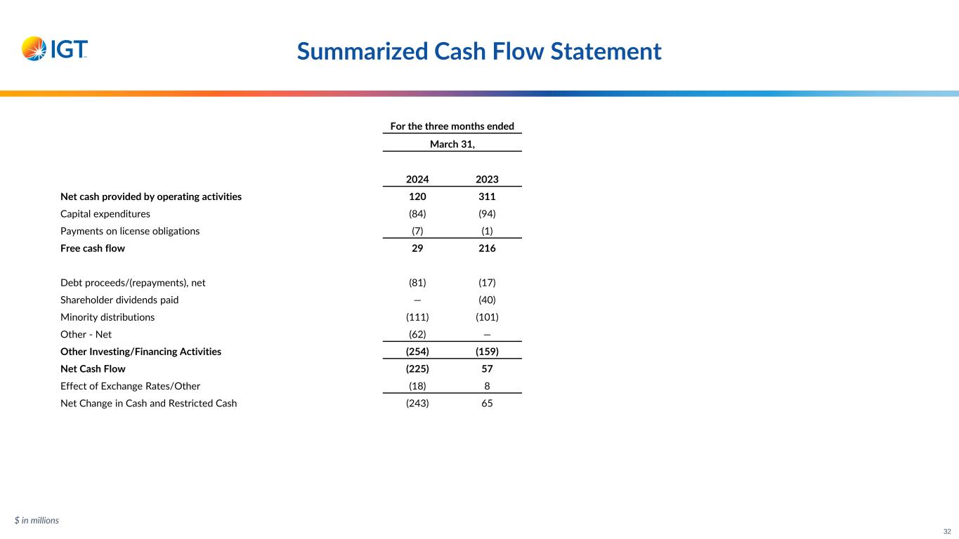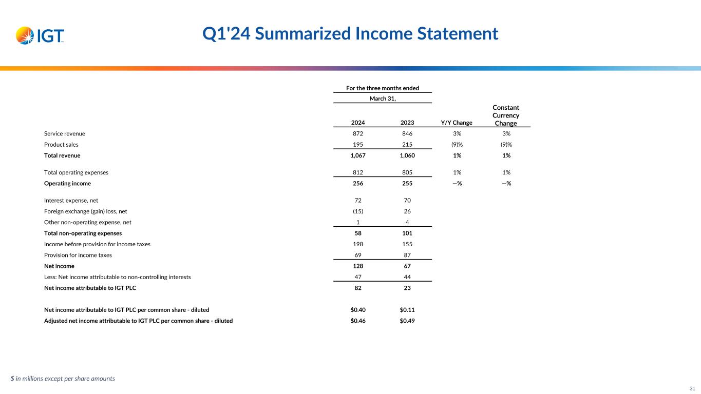 Q1'24 Summarized Income Statement For the three months ended March 31, 2024 2023 Y/Y Change Constant Currency Change Service revenue 872 846 3% 3% Product sales 195 215 (9)% (9)% Total revenue 1,067 1,060 1% 1% Total operating expenses 812 805 1% 1% Operating income 256 255 —% —% Interest expense, net 72 70 Foreign exchange (gain) loss, net (15) 26 Other non-operating expense, net 1 4 Total non-operating expenses 58 101 Income before provision for income taxes 198 155 Provision for income taxes 69 87 Net income 128 67 Less: Net income attributable to non-controlling interests 47 44 Net income attributable to IGT PLC 82 23 Net income attributable to IGT PLC per common share - diluted $0.40 $0.11 Adjusted net income attributable to IGT PLC per common share - diluted $0.46 $0.49 $ in millions except per share amounts 31