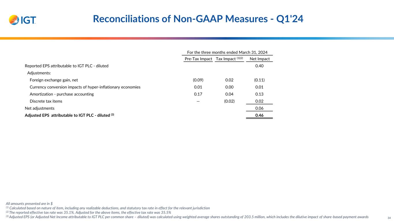 For the three months ended March 31, 2024 Pre-Tax Impact Tax Impact (1)(2) Net Impact Reported EPS attributable to IGT PLC - diluted 0.40 Adjustments: Foreign exchange gain, net (0.09) 0.02 (0.11) Currency conversion impacts of hyper-inflationary economies 0.01 0.00 0.01 Amortization - purchase accounting 0.17 0.04 0.13 Discrete tax items — (0.02) 0.02 Net adjustments 0.06 Adjusted EPS attributable to IGT PLC - diluted (3) 0.46 Reconciliations of Non-GAAP Measures - Q1'24 All amounts presented are in $ (1) Calculated based on nature of item, including any realizable deductions, and statutory tax rate in effect for the relevant jurisdiction (2) The reported effective tax rate was 35.1%. Adjusted for the above items, the effective tax rate was 35.5% (3) Adjusted EPS (or Adjusted Net Income attributable to IGT PLC per common share – diluted) was calculated using weighted average shares outstanding of 203.5 million, which includes the dilutive impact of share-based payment awards 34