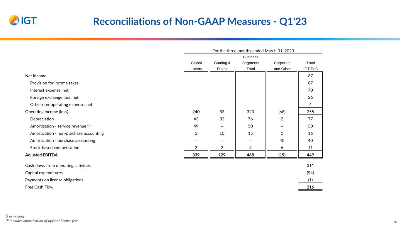 $ in millions (1) Includes amortization of upfront license fees For the three months ended March 31, 2023 Business Global Gaming & Segments Corporate Total Lottery Digital Total and Other IGT PLC Net income 67 Provision for income taxes 87 Interest expense, net 70 Foreign exchange loss, net 26 Other non-operating expense, net 4 Operating income (loss) 240 83 323 (68) 255 Depreciation 43 33 76 2 77 Amortization - service revenue (1) 49 — 50 — 50 Amortization - non-purchase accounting 5 10 15 1 16 Amortization - purchase accounting — — — 40 40 Stock-based compensation 2 2 4 6 11 Adjusted EBITDA 339 129 468 (19) 449 Cash flows from operating activities 311 Capital expenditures (94) Payments on license obligations (1) Free Cash Flow 216 Reconciliations of Non-GAAP Measures - Q1'23 35
