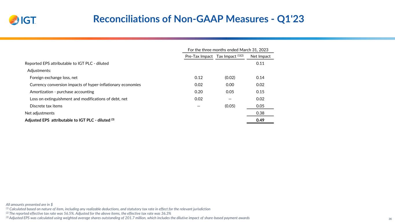 For the three months ended March 31, 2023 Pre-Tax Impact Tax Impact (1)(2) Net Impact Reported EPS attributable to IGT PLC - diluted 0.11 Adjustments: Foreign exchange loss, net 0.12 (0.02) 0.14 Currency conversion impacts of hyper-inflationary economies 0.02 0.00 0.02 Amortization - purchase accounting 0.20 0.05 0.15 Loss on extinguishment and modifications of debt, net 0.02 — 0.02 Discrete tax items — (0.05) 0.05 Net adjustments 0.38 Adjusted EPS attributable to IGT PLC - diluted (3) 0.49 All amounts presented are in $ (1) Calculated based on nature of item, including any realizable deductions, and statutory tax rate in effect for the relevant jurisdiction (2) The reported effective tax rate was 56.5%. Adjusted for the above items, the effective tax rate was 36.3% (3) Adjusted EPS was calculated using weighted average shares outstanding of 201.7 million, which includes the dilutive impact of share-based payment awards Reconciliations of Non-GAAP Measures - Q1'23 36