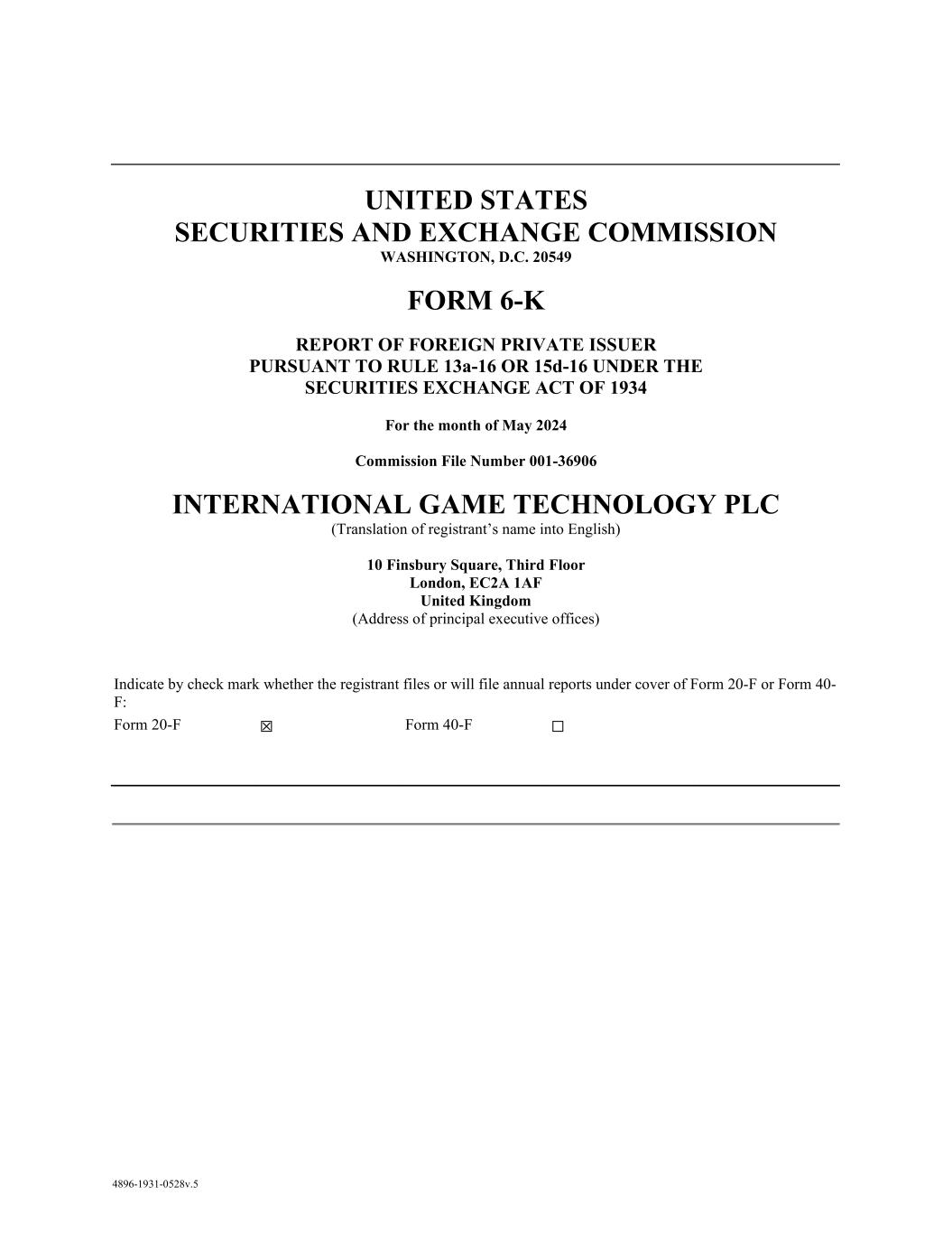 UNITED STATES SECURITIES AND EXCHANGE COMMISSION WASHINGTON, D.C. 20549 FORM 6-K REPORT OF FOREIGN PRIVATE ISSUER PURSUANT TO RULE 13a-16 OR 15d-16 UNDER THE SECURITIES EXCHANGE ACT OF 1934 For the month of May 2024 Commission File Number 001-36906 INTERNATIONAL GAME TECHNOLOGY PLC (Translation of registrant’s name into English) 10 Finsbury Square, Third Floor London, EC2A 1AF United Kingdom (Address of principal executive offices) Indicate by check mark whether the registrant files or will file annual reports under cover of Form 20-F or Form 40- F: Form 20-F ☒ Form 40-F ☐ 4896-1931-0528v.5