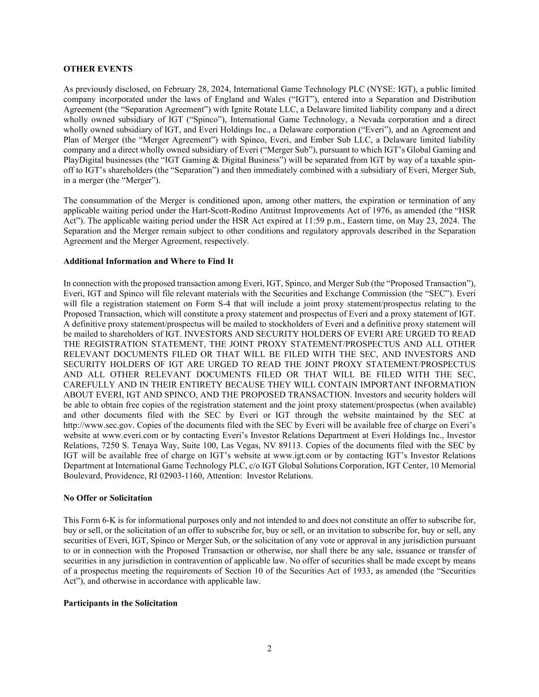 2 OTHER EVENTS As previously disclosed, on February 28, 2024, International Game Technology PLC (NYSE: IGT), a public limited company incorporated under the laws of England and Wales (“IGT”), entered into a Separation and Distribution Agreement (the “Separation Agreement”) with Ignite Rotate LLC, a Delaware limited liability company and a direct wholly owned subsidiary of IGT (“Spinco”), International Game Technology, a Nevada corporation and a direct wholly owned subsidiary of IGT, and Everi Holdings Inc., a Delaware corporation (“Everi”), and an Agreement and Plan of Merger (the “Merger Agreement”) with Spinco, Everi, and Ember Sub LLC, a Delaware limited liability company and a direct wholly owned subsidiary of Everi (“Merger Sub”), pursuant to which IGT’s Global Gaming and PlayDigital businesses (the “IGT Gaming & Digital Business”) will be separated from IGT by way of a taxable spin- off to IGT’s shareholders (the “Separation”) and then immediately combined with a subsidiary of Everi, Merger Sub, in a merger (the “Merger”). The consummation of the Merger is conditioned upon, among other matters, the expiration or termination of any applicable waiting period under the Hart-Scott-Rodino Antitrust Improvements Act of 1976, as amended (the “HSR Act”). The applicable waiting period under the HSR Act expired at 11:59 p.m., Eastern time, on May 23, 2024. The Separation and the Merger remain subject to other conditions and regulatory approvals described in the Separation Agreement and the Merger Agreement, respectively. Additional Information and Where to Find It In connection with the proposed transaction among Everi, IGT, Spinco, and Merger Sub (the “Proposed Transaction”), Everi, IGT and Spinco will file relevant materials with the Securities and Exchange Commission (the “SEC”). Everi will file a registration statement on Form S-4 that will include a joint proxy statement/prospectus relating to the Proposed Transaction, which will constitute a proxy statement and prospectus of Everi and a proxy statement of IGT. A definitive proxy statement/prospectus will be mailed to stockholders of Everi and a definitive proxy statement will be mailed to shareholders of IGT. INVESTORS AND SECURITY HOLDERS OF EVERI ARE URGED TO READ THE REGISTRATION STATEMENT, THE JOINT PROXY STATEMENT/PROSPECTUS AND ALL OTHER RELEVANT DOCUMENTS FILED OR THAT WILL BE FILED WITH THE SEC, AND INVESTORS AND SECURITY HOLDERS OF IGT ARE URGED TO READ THE JOINT PROXY STATEMENT/PROSPECTUS AND ALL OTHER RELEVANT DOCUMENTS FILED OR THAT WILL BE FILED WITH THE SEC, CAREFULLY AND IN THEIR ENTIRETY BECAUSE THEY WILL CONTAIN IMPORTANT INFORMATION ABOUT EVERI, IGT AND SPINCO, AND THE PROPOSED TRANSACTION. Investors and security holders will be able to obtain free copies of the registration statement and the joint proxy statement/prospectus (when available) and other documents filed with the SEC by Everi or IGT through the website maintained by the SEC at http://www.sec.gov. Copies of the documents filed with the SEC by Everi will be available free of charge on Everi’s website at www.everi.com or by contacting Everi’s Investor Relations Department at Everi Holdings Inc., Investor Relations, 7250 S. Tenaya Way, Suite 100, Las Vegas, NV 89113. Copies of the documents filed with the SEC by IGT will be available free of charge on IGT’s website at www.igt.com or by contacting IGT’s Investor Relations Department at International Game Technology PLC, c/o IGT Global Solutions Corporation, IGT Center, 10 Memorial Boulevard, Providence, RI 02903-1160, Attention: Investor Relations. No Offer or Solicitation This Form 6-K is for informational purposes only and not intended to and does not constitute an offer to subscribe for, buy or sell, or the solicitation of an offer to subscribe for, buy or sell, or an invitation to subscribe for, buy or sell, any securities of Everi, IGT, Spinco or Merger Sub, or the solicitation of any vote or approval in any jurisdiction pursuant to or in connection with the Proposed Transaction or otherwise, nor shall there be any sale, issuance or transfer of securities in any jurisdiction in contravention of applicable law. No offer of securities shall be made except by means of a prospectus meeting the requirements of Section 10 of the Securities Act of 1933, as amended (the “Securities Act”), and otherwise in accordance with applicable law. Participants in the Solicitation