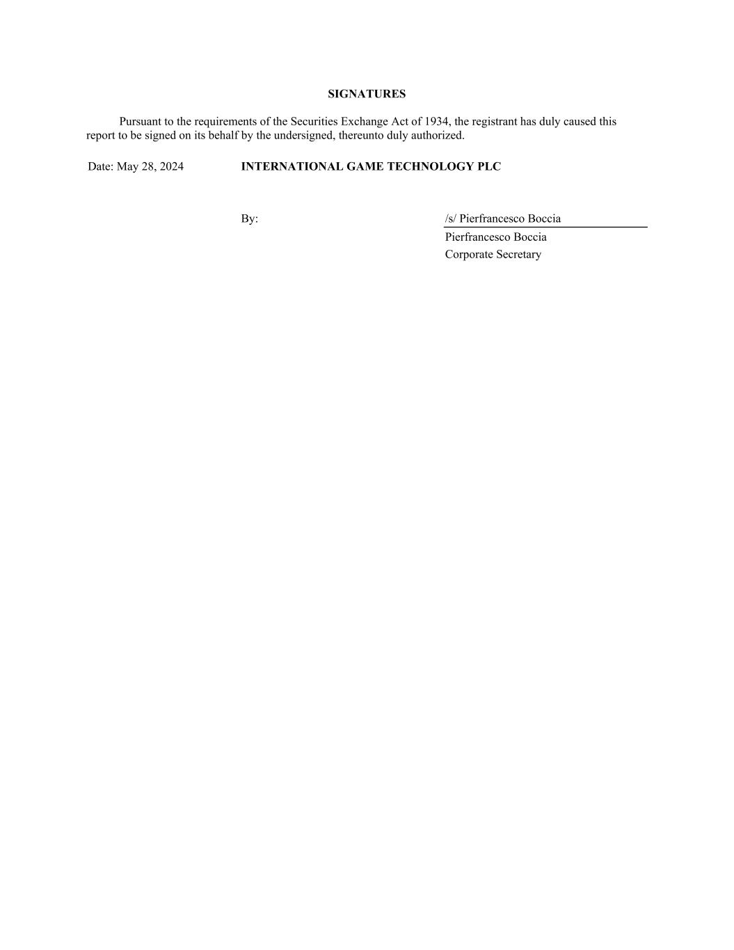 SIGNATURES Pursuant to the requirements of the Securities Exchange Act of 1934, the registrant has duly caused this report to be signed on its behalf by the undersigned, thereunto duly authorized. Date: May 28, 2024 INTERNATIONAL GAME TECHNOLOGY PLC By: /s/ Pierfrancesco Boccia Pierfrancesco Boccia Corporate Secretary