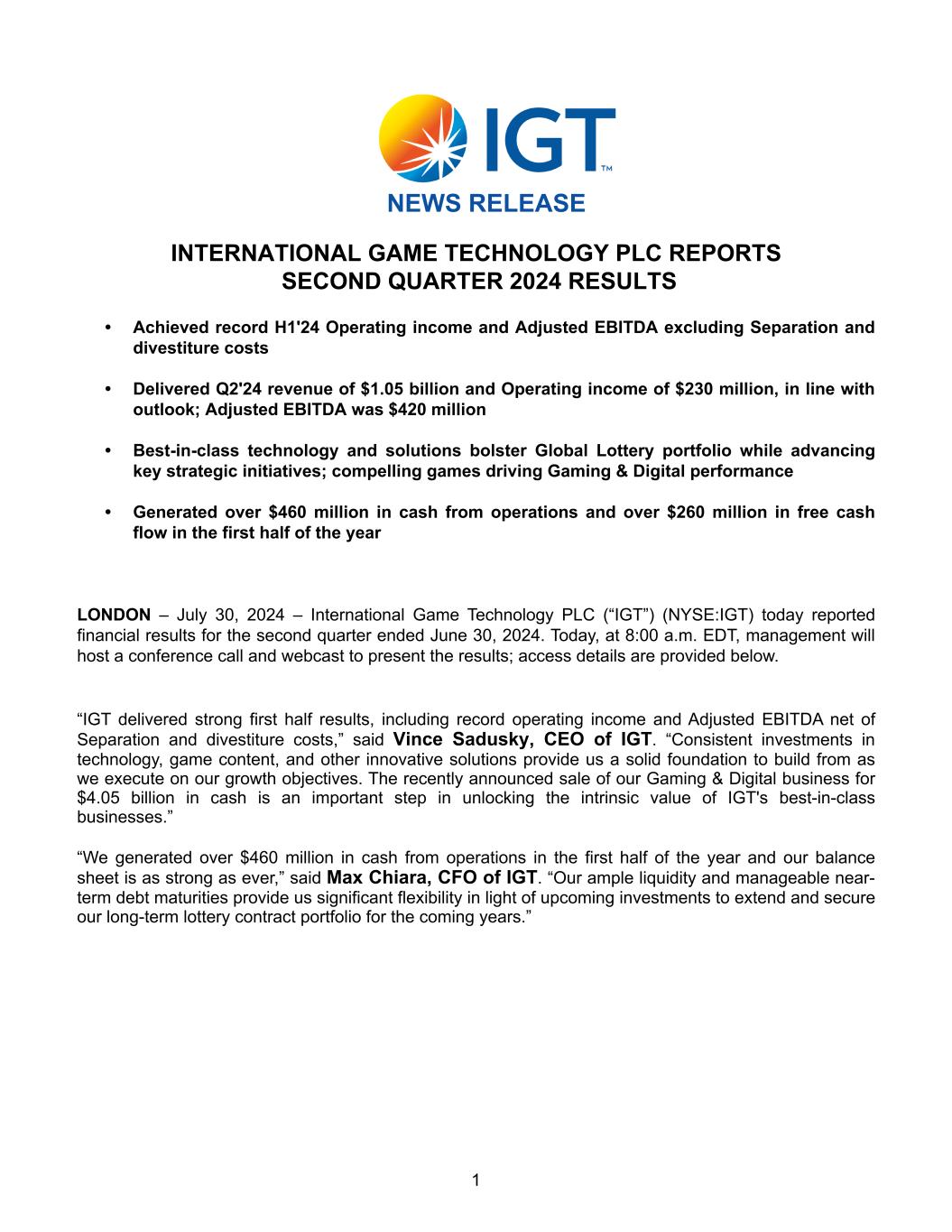 NEWS RELEASE INTERNATIONAL GAME TECHNOLOGY PLC REPORTS SECOND QUARTER 2024 RESULTS • Achieved record H1'24 Operating income and Adjusted EBITDA excluding Separation and divestiture costs • Delivered Q2'24 revenue of $1.05 billion and Operating income of $230 million, in line with outlook; Adjusted EBITDA was $420 million • Best-in-class technology and solutions bolster Global Lottery portfolio while advancing key strategic initiatives; compelling games driving Gaming & Digital performance • Generated over $460 million in cash from operations and over $260 million in free cash flow in the first half of the year LONDON – July 30, 2024 – International Game Technology PLC (“IGT”) (NYSE:IGT) today reported financial results for the second quarter ended June 30, 2024. Today, at 8:00 a.m. EDT, management will host a conference call and webcast to present the results; access details are provided below. “IGT delivered strong first half results, including record operating income and Adjusted EBITDA net of Separation and divestiture costs,” said Vince Sadusky, CEO of IGT. “Consistent investments in technology, game content, and other innovative solutions provide us a solid foundation to build from as we execute on our growth objectives. The recently announced sale of our Gaming & Digital business for $4.05 billion in cash is an important step in unlocking the intrinsic value of IGT's best-in-class businesses.” “We generated over $460 million in cash from operations in the first half of the year and our balance sheet is as strong as ever,” said Max Chiara, CFO of IGT. “Our ample liquidity and manageable near- term debt maturities provide us significant flexibility in light of upcoming investments to extend and secure our long-term lottery contract portfolio for the coming years.” 1