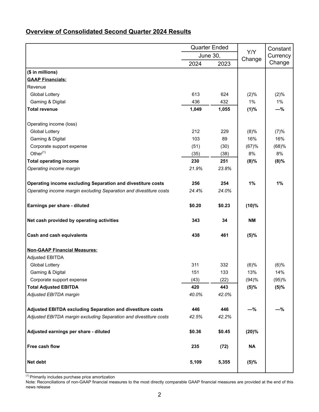 Overview of Consolidated Second Quarter 2024 Results Quarter Ended Y/Y Change Constant Currency Change June 30, 2024 2023 ($ in millions) GAAP Financials: Revenue Global Lottery 613 624 (2)% (2)% Gaming & Digital 436 432 1% 1% Total revenue 1,049 1,055 (1)% —% Operating income (loss) Global Lottery 212 229 (8)% (7)% Gaming & Digital 103 89 16% 16% Corporate support expense (51) (30) (67)% (68)% Other(1) (35) (38) 8% 8% Total operating income 230 251 (8)% (8)% Operating income margin 21.9% 23.8% Operating income excluding Separation and divestiture costs 256 254 1% 1% Operating income margin excluding Separation and divestiture costs 24.4% 24.0% Earnings per share - diluted $0.20 $0.23 (10)% Net cash provided by operating activities 343 34 NM Cash and cash equivalents 438 461 (5)% Non-GAAP Financial Measures: Adjusted EBITDA Global Lottery 311 332 (6)% (6)% Gaming & Digital 151 133 13% 14% Corporate support expense (43) (22) (94)% (95)% Total Adjusted EBITDA 420 443 (5)% (5)% Adjusted EBITDA margin 40.0% 42.0% Adjusted EBITDA excluding Separation and divestiture costs 446 446 —% —% Adjusted EBITDA margin excluding Separation and divestiture costs 42.5% 42.2% Adjusted earnings per share - diluted $0.36 $0.45 (20)% Free cash flow 235 (72) NA Net debt 5,109 5,355 (5)% (1) Primarily includes purchase price amortization Note: Reconciliations of non-GAAP financial measures to the most directly comparable GAAP financial measures are provided at the end of this news release 2