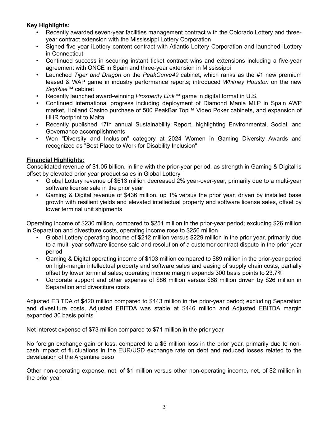 Key Highlights: • Recently awarded seven-year facilities management contract with the Colorado Lottery and three- year contract extension with the Mississippi Lottery Corporation • Signed five-year iLottery content contract with Atlantic Lottery Corporation and launched iLottery in Connecticut • Continued success in securing instant ticket contract wins and extensions including a five-year agreement with ONCE in Spain and three-year extension in Mississippi • Launched Tiger and Dragon on the PeakCurve49 cabinet, which ranks as the #1 new premium leased & WAP game in industry performance reports; introduced Whitney Houston on the new SkyRise™ cabinet • Recently launched award-winning Prosperity Link™ game in digital format in U.S. • Continued international progress including deployment of Diamond Mania MLP in Spain AWP market, Holland Casino purchase of 500 PeakBar Top™ Video Poker cabinets, and expansion of HHR footprint to Malta • Recently published 17th annual Sustainability Report, highlighting Environmental, Social, and Governance accomplishments • Won "Diversity and Inclusion" category at 2024 Women in Gaming Diversity Awards and recognized as "Best Place to Work for Disability Inclusion" Financial Highlights: Consolidated revenue of $1.05 billion, in line with the prior-year period, as strength in Gaming & Digital is offset by elevated prior year product sales in Global Lottery • Global Lottery revenue of $613 million decreased 2% year-over-year, primarily due to a multi-year software license sale in the prior year • Gaming & Digital revenue of $436 million, up 1% versus the prior year, driven by installed base growth with resilient yields and elevated intellectual property and software license sales, offset by lower terminal unit shipments Operating income of $230 million, compared to $251 million in the prior-year period; excluding $26 million in Separation and divestiture costs, operating income rose to $256 million • Global Lottery operating income of $212 million versus $229 million in the prior year, primarily due to a multi-year software license sale and resolution of a customer contract dispute in the prior-year period • Gaming & Digital operating income of $103 million compared to $89 million in the prior-year period on high-margin intellectual property and software sales and easing of supply chain costs, partially offset by lower terminal sales; operating income margin expands 300 basis points to 23.7% • Corporate support and other expense of $86 million versus $68 million driven by $26 million in Separation and divestiture costs Adjusted EBITDA of $420 million compared to $443 million in the prior-year period; excluding Separation and divestiture costs, Adjusted EBITDA was stable at $446 million and Adjusted EBITDA margin expanded 30 basis points Net interest expense of $73 million compared to $71 million in the prior year No foreign exchange gain or loss, compared to a $5 million loss in the prior year, primarily due to non- cash impact of fluctuations in the EUR/USD exchange rate on debt and reduced losses related to the devaluation of the Argentine peso Other non-operating expense, net, of $1 million versus other non-operating income, net, of $2 million in the prior year 3